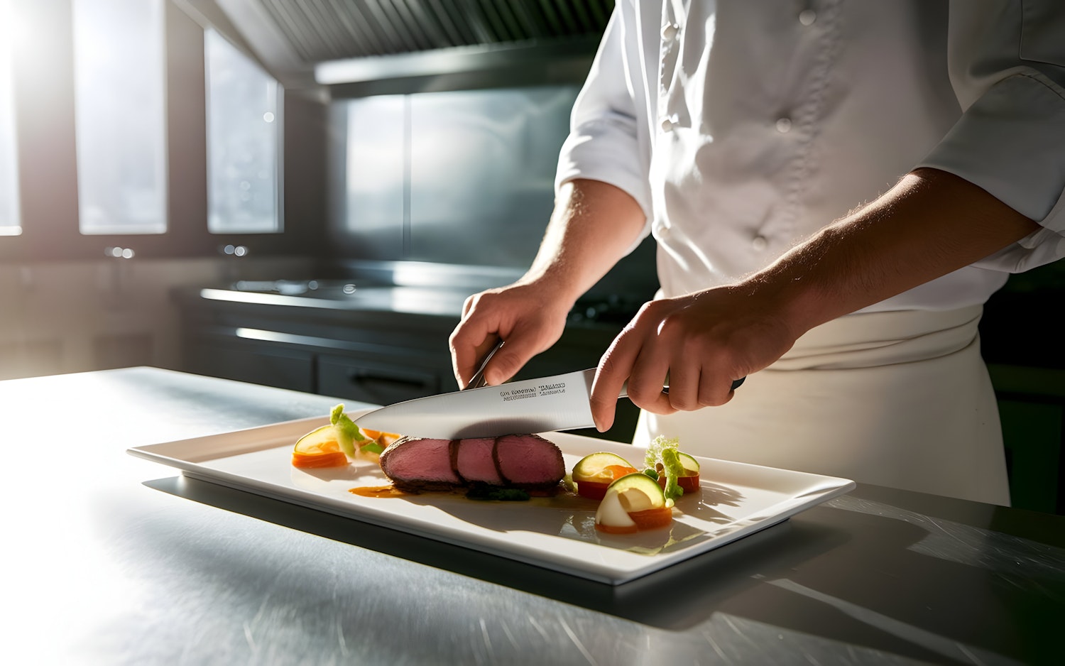 A chef slices medium-rare meat on a white plate with vibrant vegetable garnishes in a sunlit professional kitchen.
