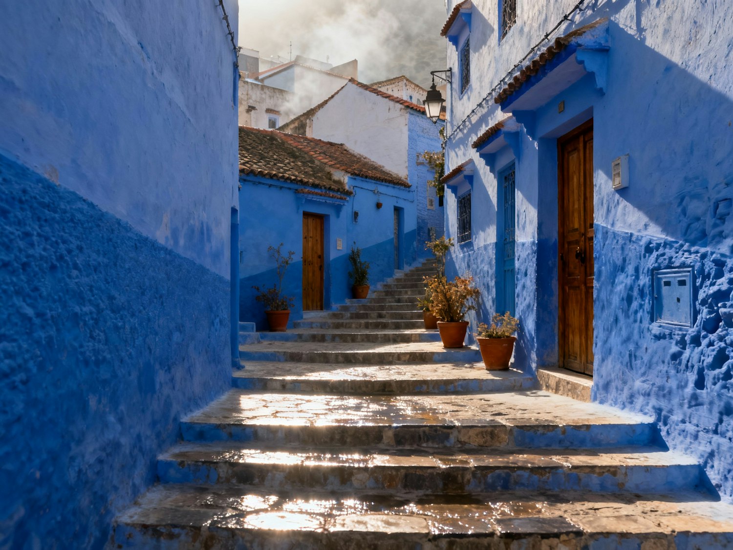 Explore the vibrant blue streets of Chefchaouen, Morocco, with its iconic architecture, stone steps, and charming potted plants.