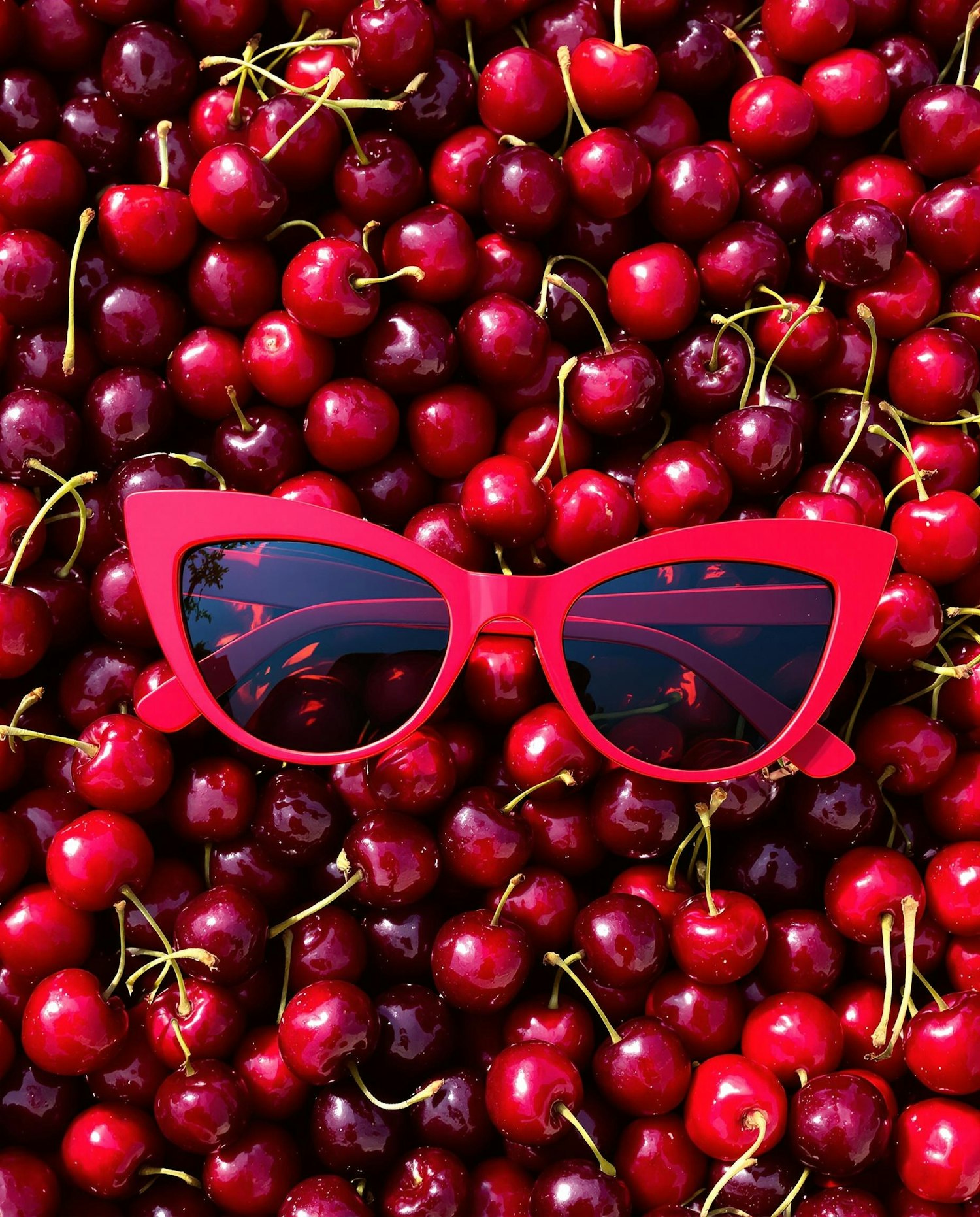 Top view of Retro cat-eye bold red sunglasses placed on a dense layer of fresh cherries, no surface visible. Summer sunlight casting strong shadows, juicy reflections and rich red tones.