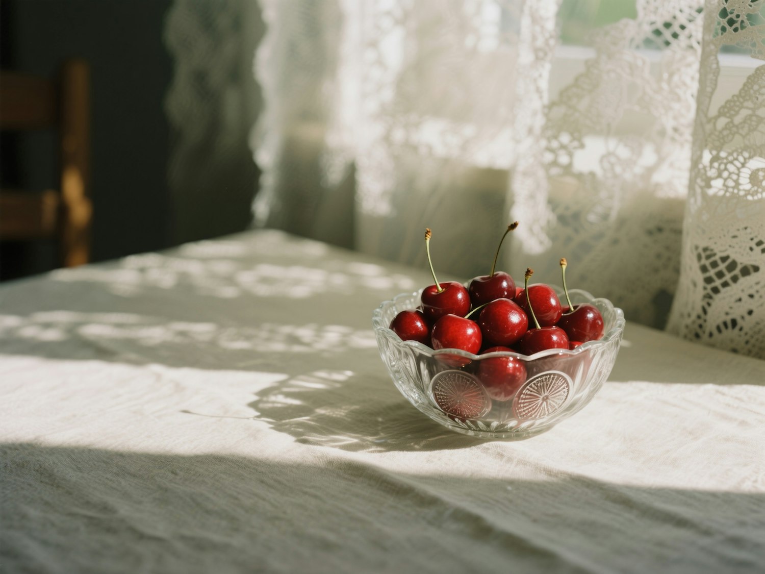 Glass bowl of fresh cherries on linen table, shadows from lace curtain, gentle summer mood.