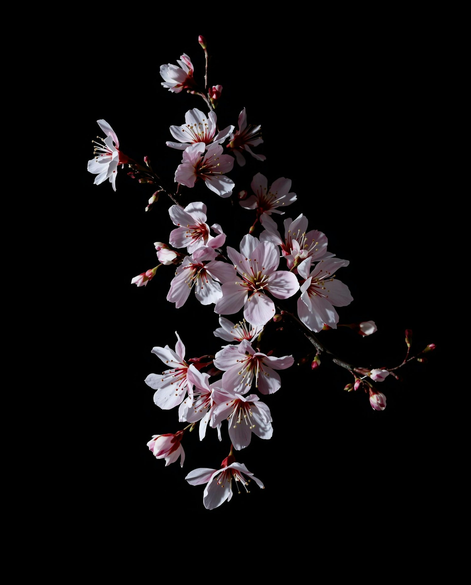 A stunning branch of cherry blossoms in full bloom, set against a black background, showcasing their soft pink and white petals.