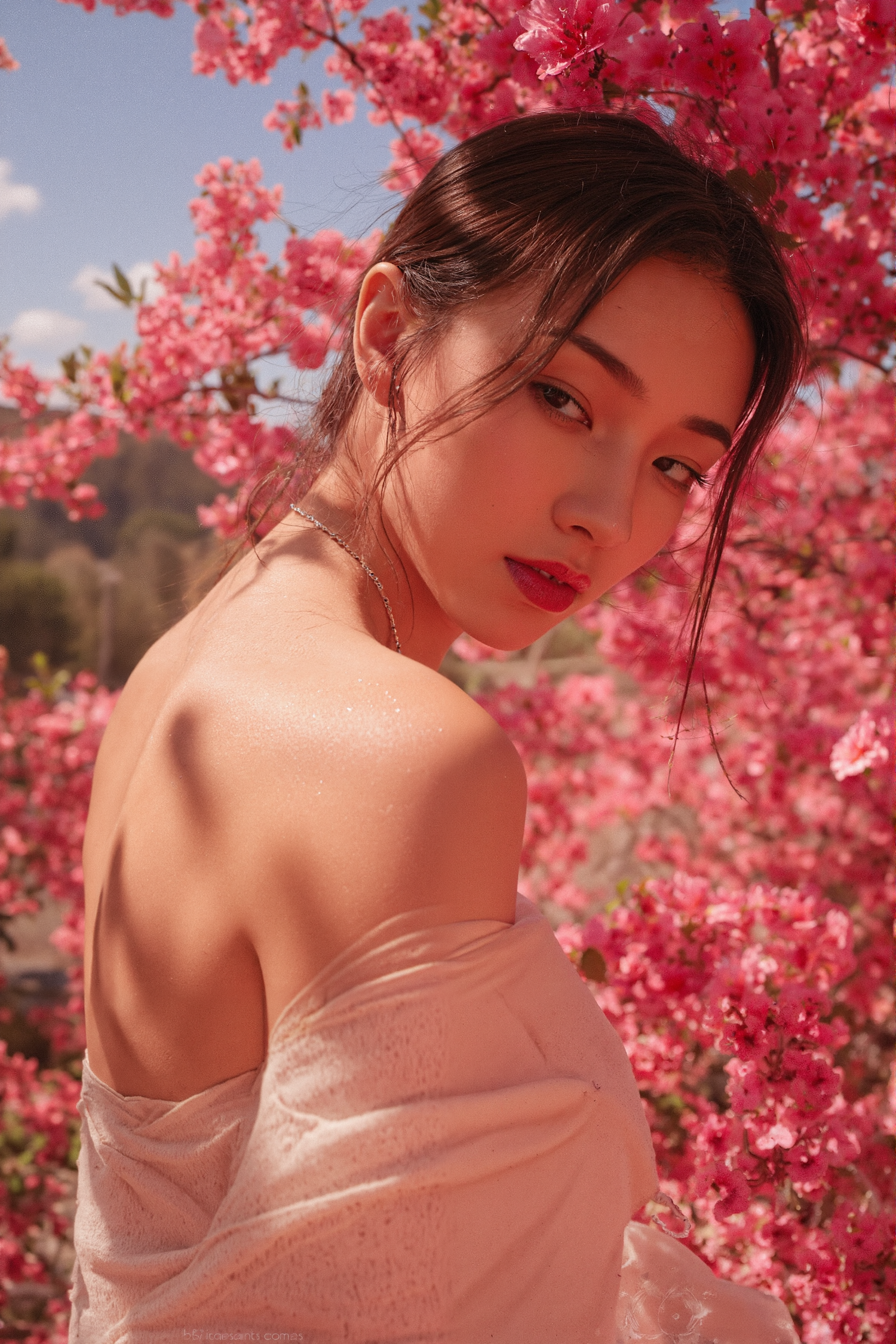A serene portrait of a woman surrounded by vibrant cherry blossoms, gazing softly over her shoulder in warm sunlight.