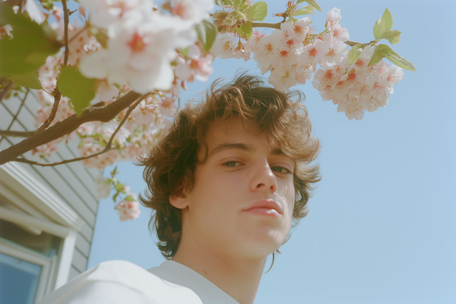 A serene portrait of a young man under blooming cherry blossoms, with a clear blue sky and soft lighting creating a dreamy vibe.