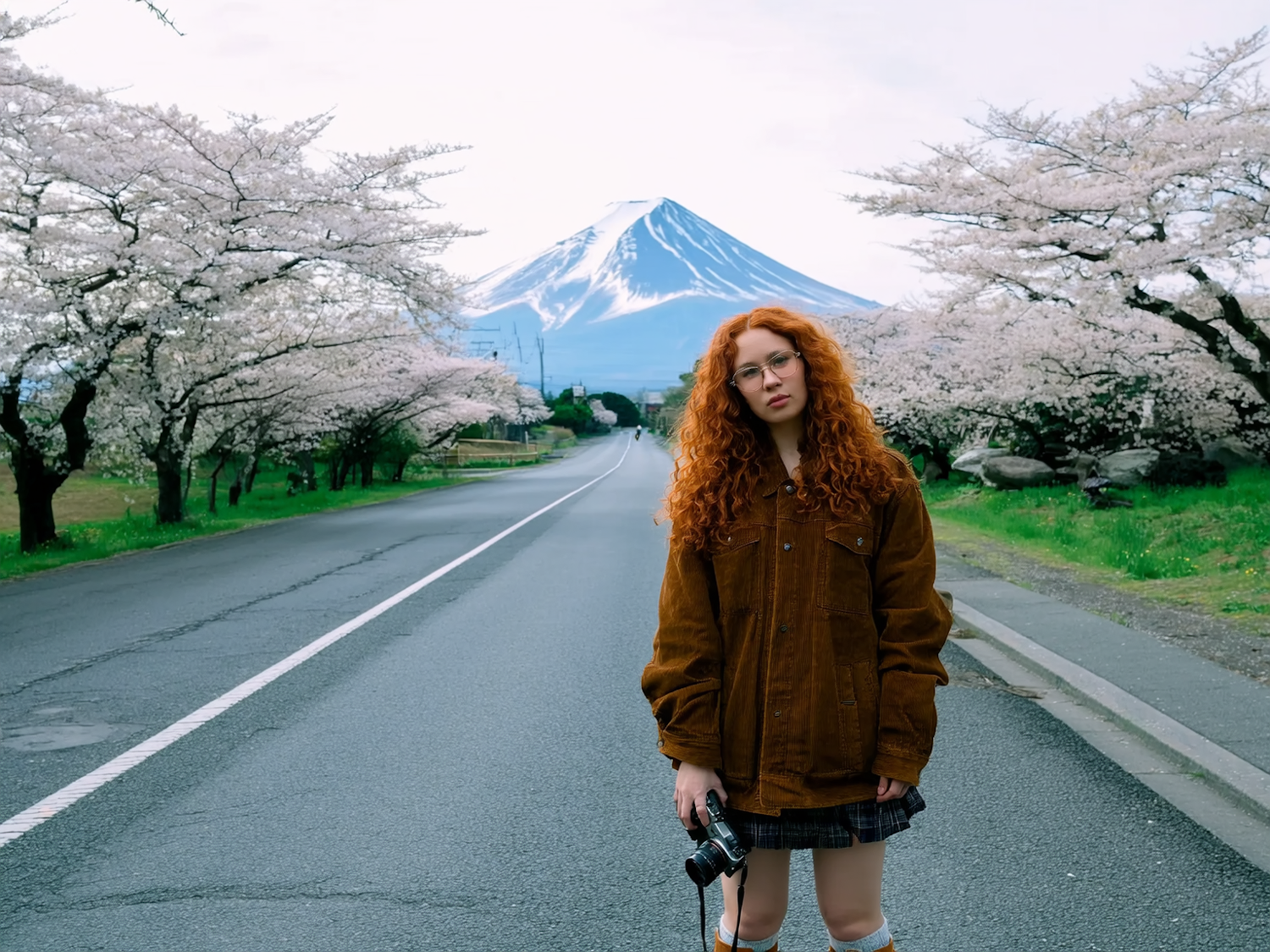 A young woman with red hair stands on a cherry blossom-lined road with Mount Fuji in the background, holding a camera. A serene spring scene.