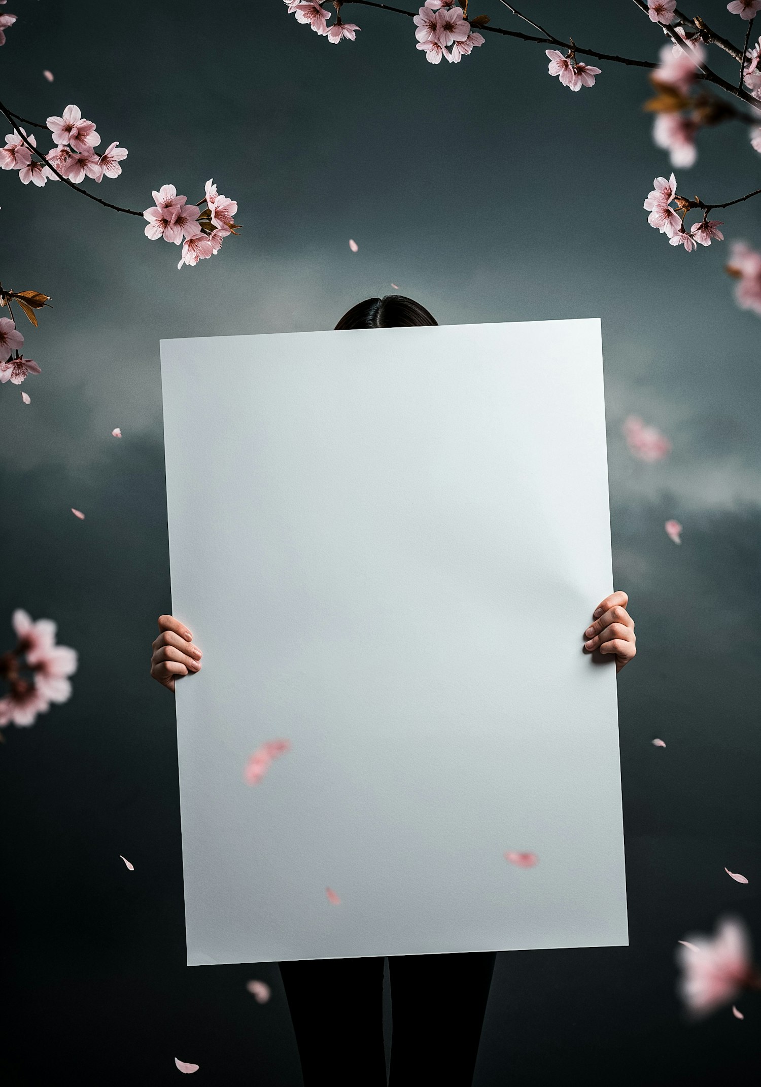 A person holds a blank white poster against a dark sky with cherry blossoms and petals floating, creating a serene and mysterious vibe.