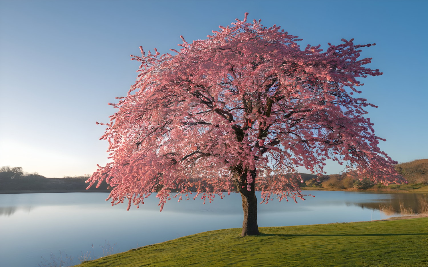 A stunning cherry blossom tree in full bloom by a serene lake, with vibrant pink flowers and a tranquil blue sky in the background.