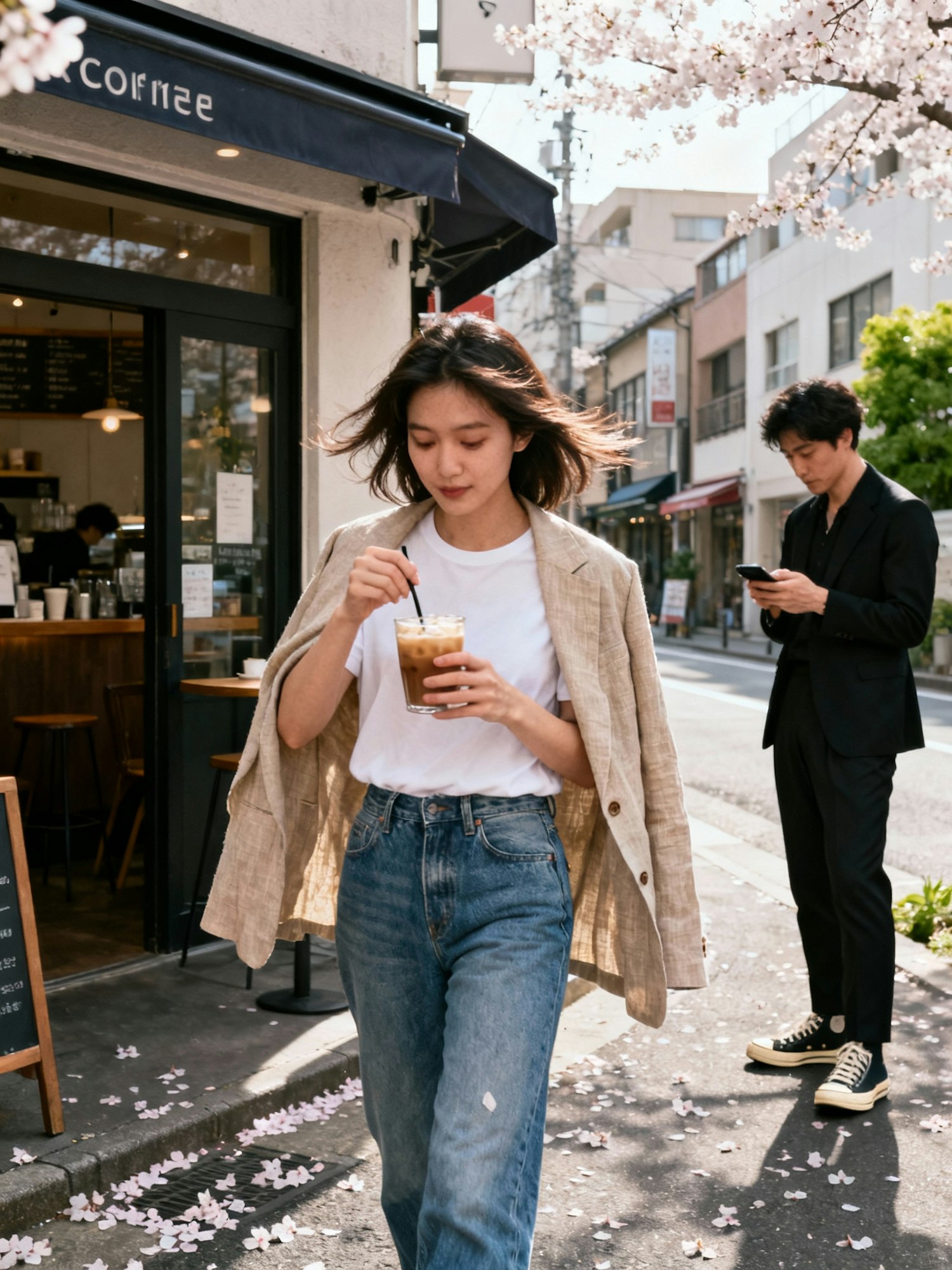 A realistic street-photography fashion image captured 'across the street' in Tokyo, spring 2025, mid-afternoon. A soft breeze moves through the narrow lanes of Nakameguro, cherry blossoms scattering lightly across the pavement. A young woman pauses beside a corner café, stirring her iced latte, wearing relaxed indigo denim, a simple white tee, and a sand-colored linen blazer draped loosely over her shoulders. Nearby, a man in tailored black trousers and vintage sneakers checks his phone, the scene unfolding in quiet synchronicity—two strangers sharing the same calm rhythm of the city. Captured on a Sony A7R V with a Zeiss 55 mm f/1.8 lens at f/2, handheld at 1/500 s, from an eye-level perspective. The 14-bit dynamic range preserves soft daylight transitions at 5600 K, with delicate Portra 400-style grain, gentle vignetting, and fine detail—an authentic glimpse of Tokyo’s effortless street elegance in motion.