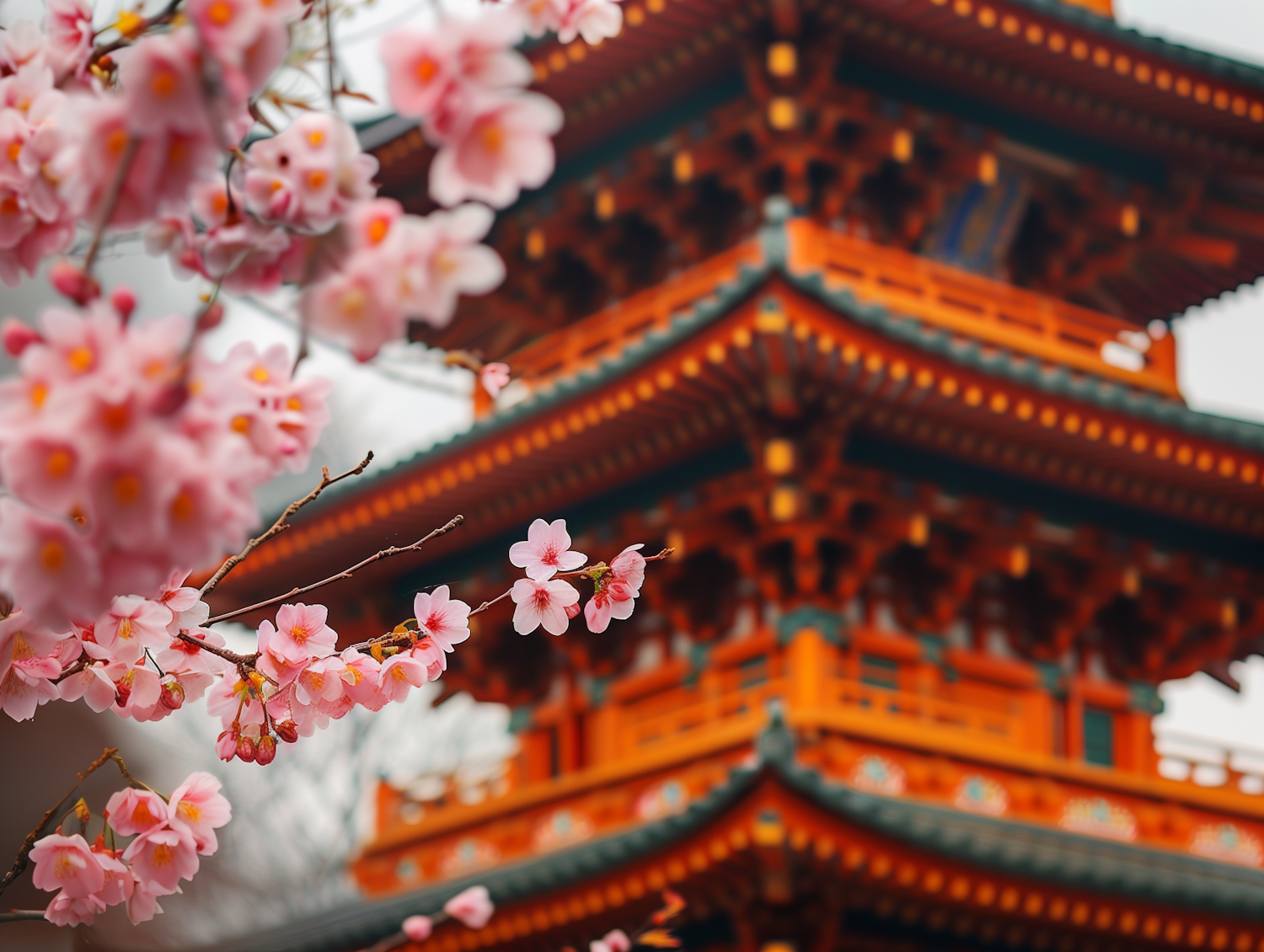 Cherry blossoms in focus with a traditional Japanese pagoda in the background, blending nature and culture beautifully.