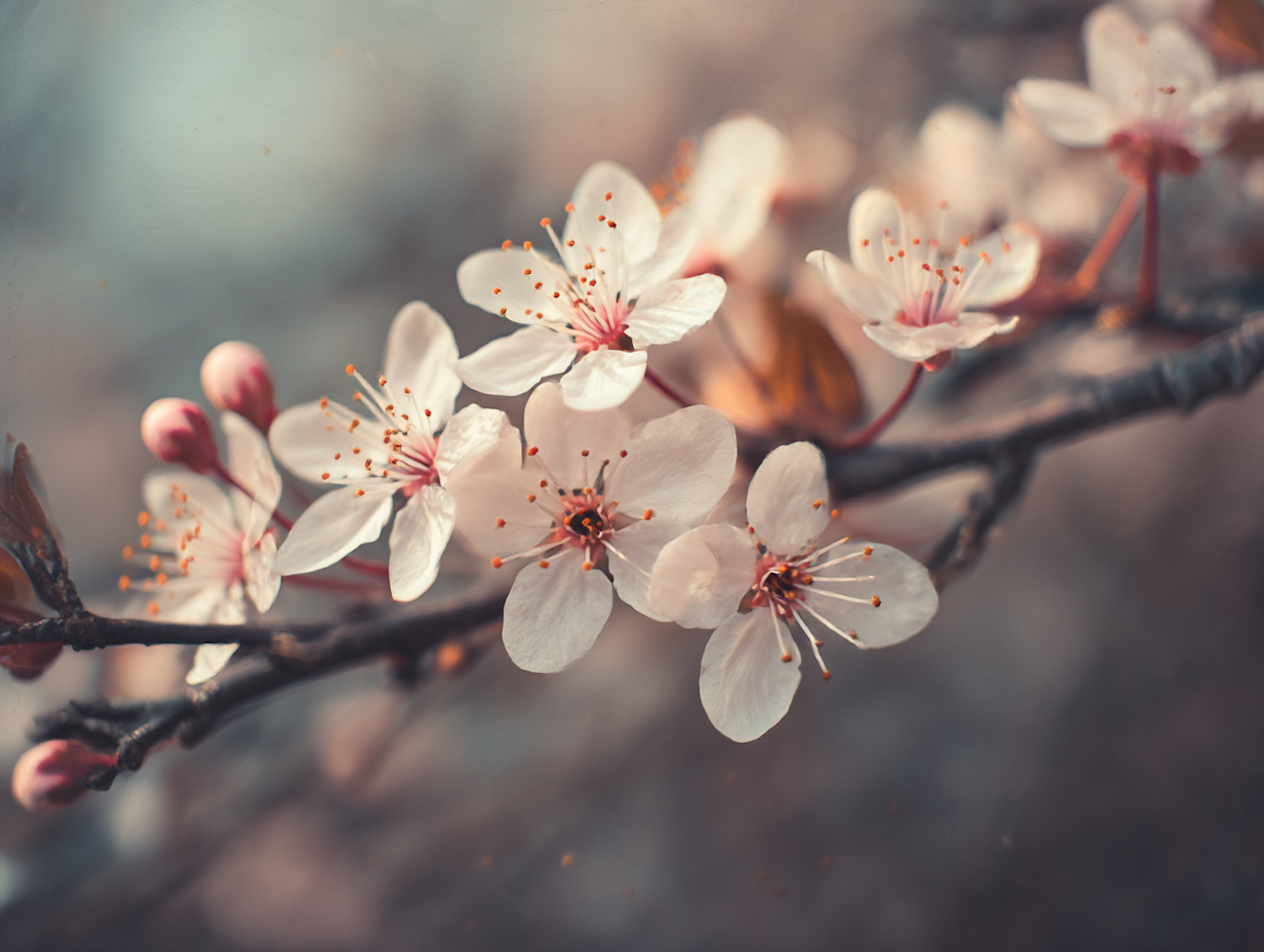 Close-up of blooming cherry blossoms with soft white petals and pink accents, set against a blurred, dreamy background.