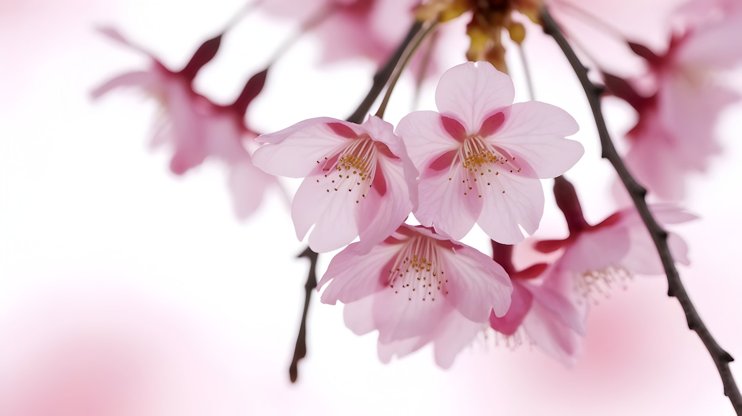 Close-up of pink cherry blossoms in full bloom, with soft petals and blurred background evoking springtime beauty and serenity.