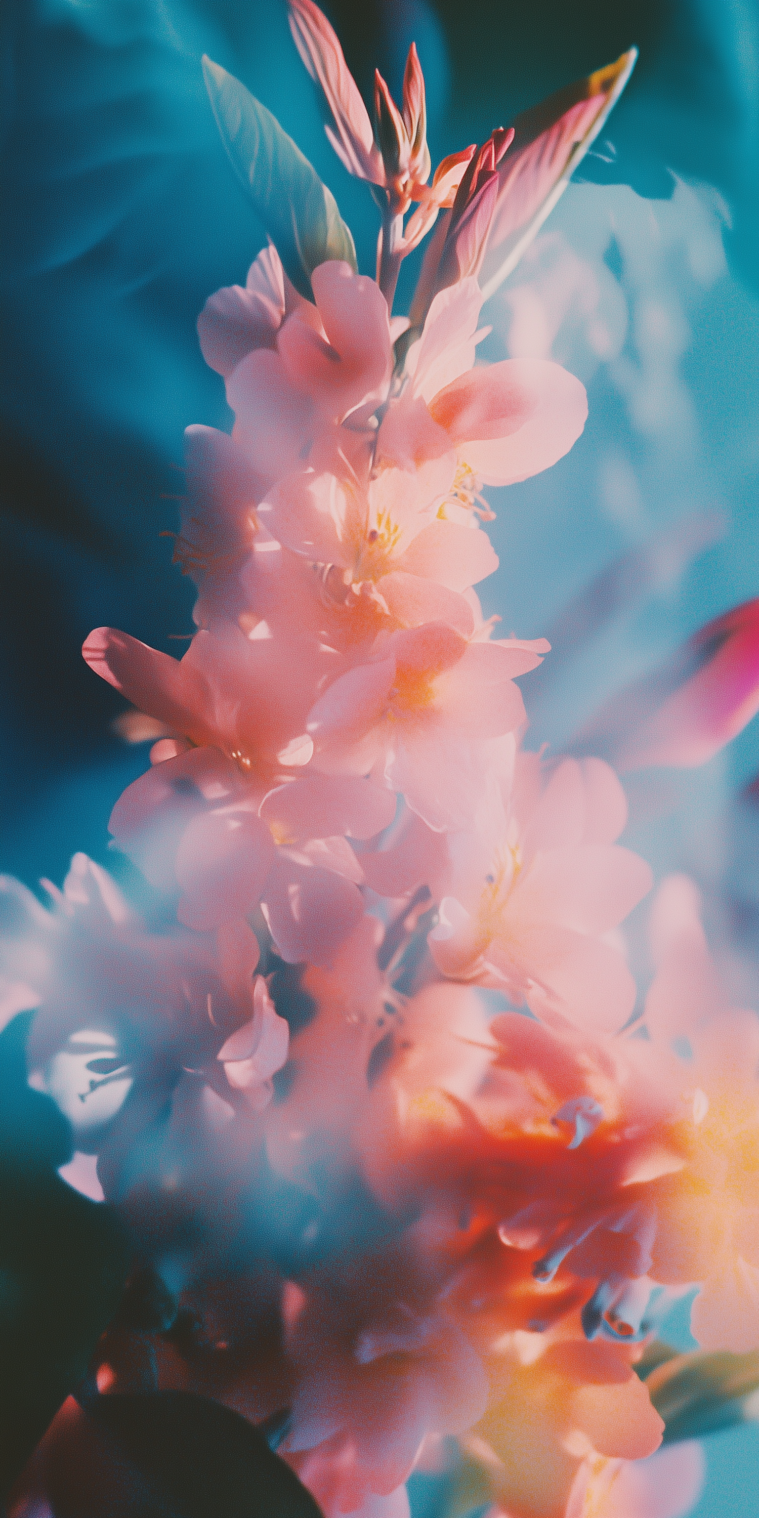 Dreamy pink flowers with soft petals against a serene blue-green background, creating a tranquil and ethereal atmosphere.