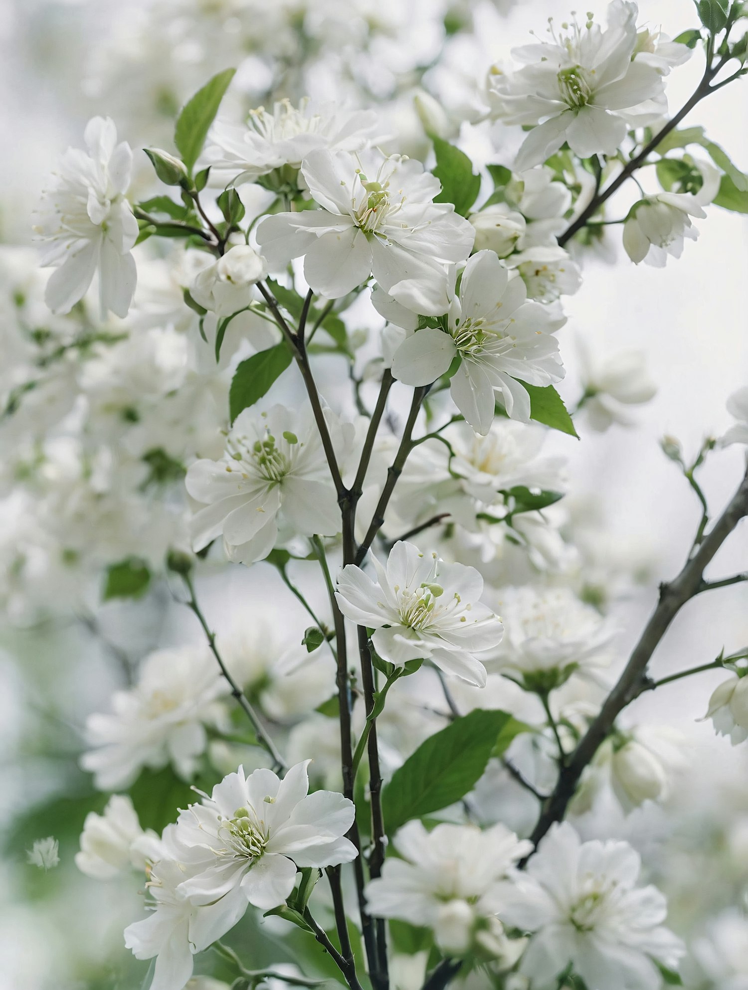 Elegant white blossoms with green leaves on slender branches, capturing the essence of spring in a serene and fresh composition.