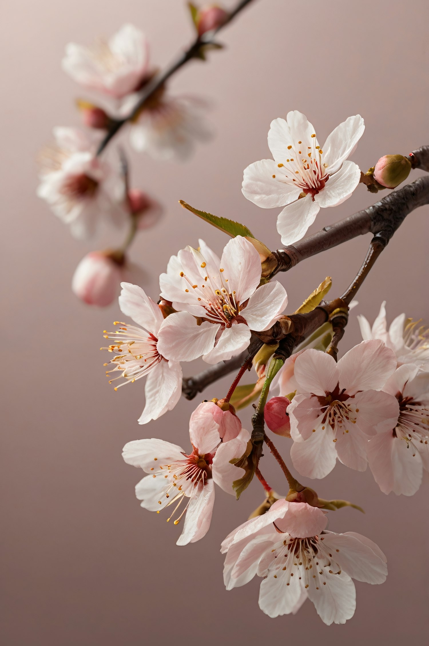 Close-up of delicate cherry blossoms on a branch, showcasing soft pink petals and vibrant yellow stamens against a muted background.