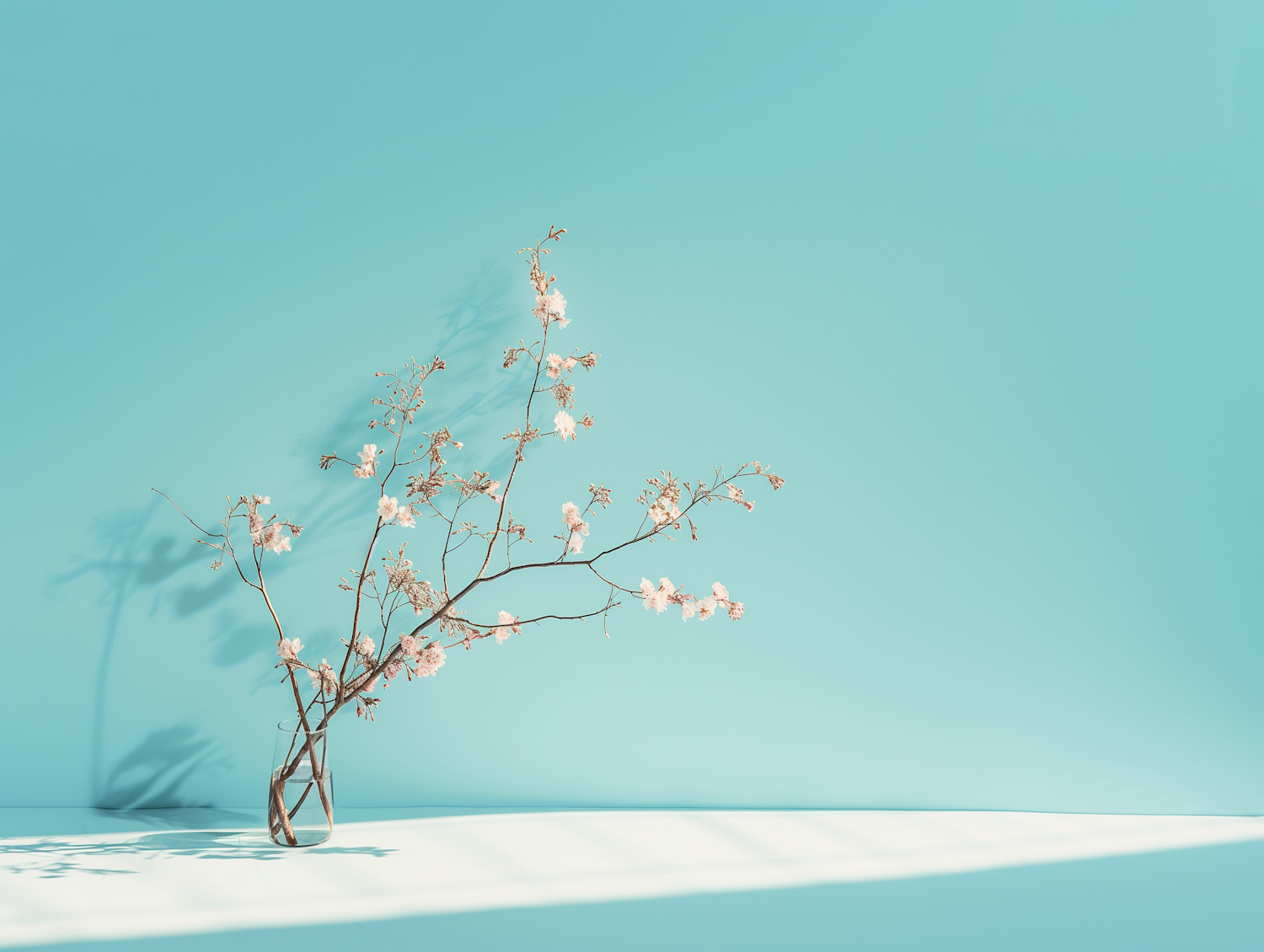 Minimalist cherry blossom branch in a glass vase against a light blue background, with soft lighting and intricate shadows.
