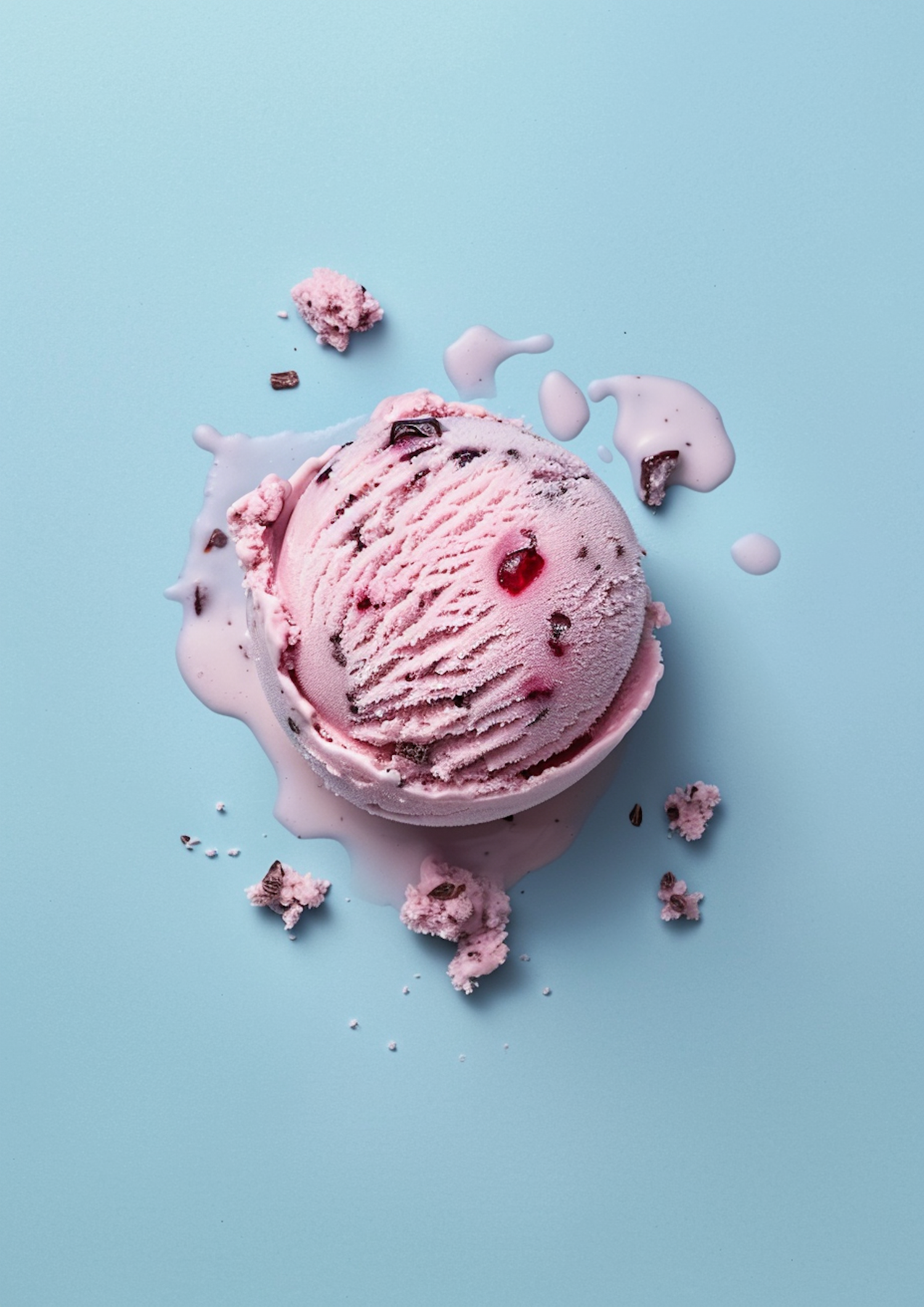 Pink ice cream scoop with chocolate and cherry chunks on a pastel blue background, slightly melting with scattered crumbs and drips.