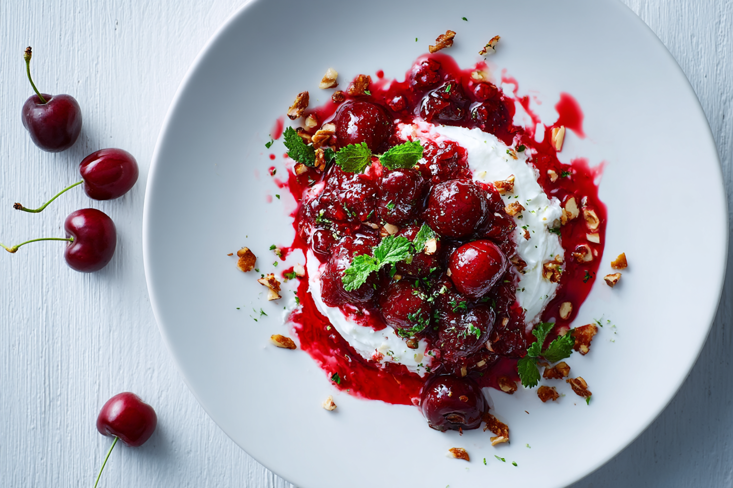 A close-up of a cherry dessert garnished with mint and nuts on a white plate, accompanied by some cherries on a white wooden table.