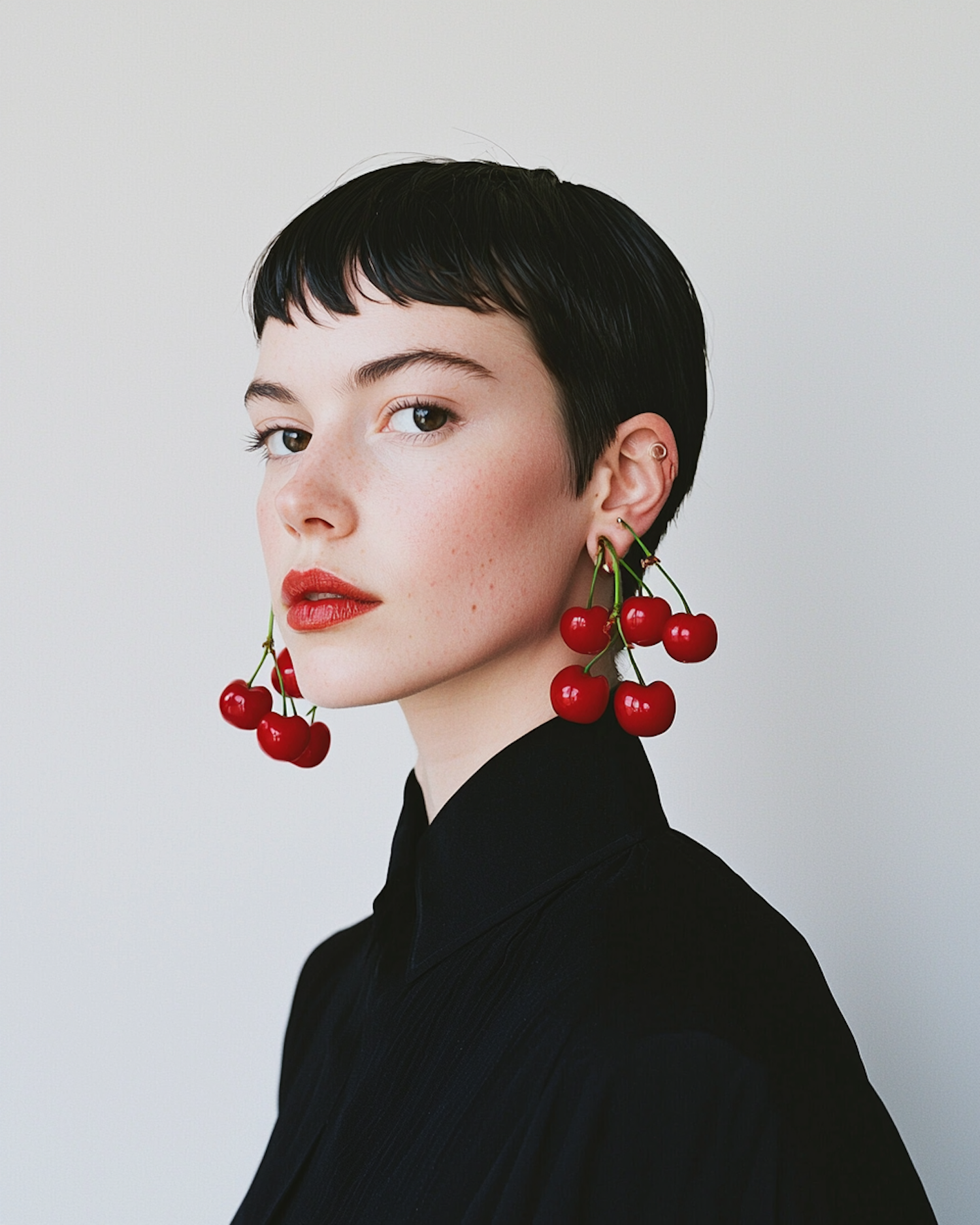 Minimalist portrait of a woman with cherry earrings, bold red lipstick, and a sleek black outfit against a plain background.