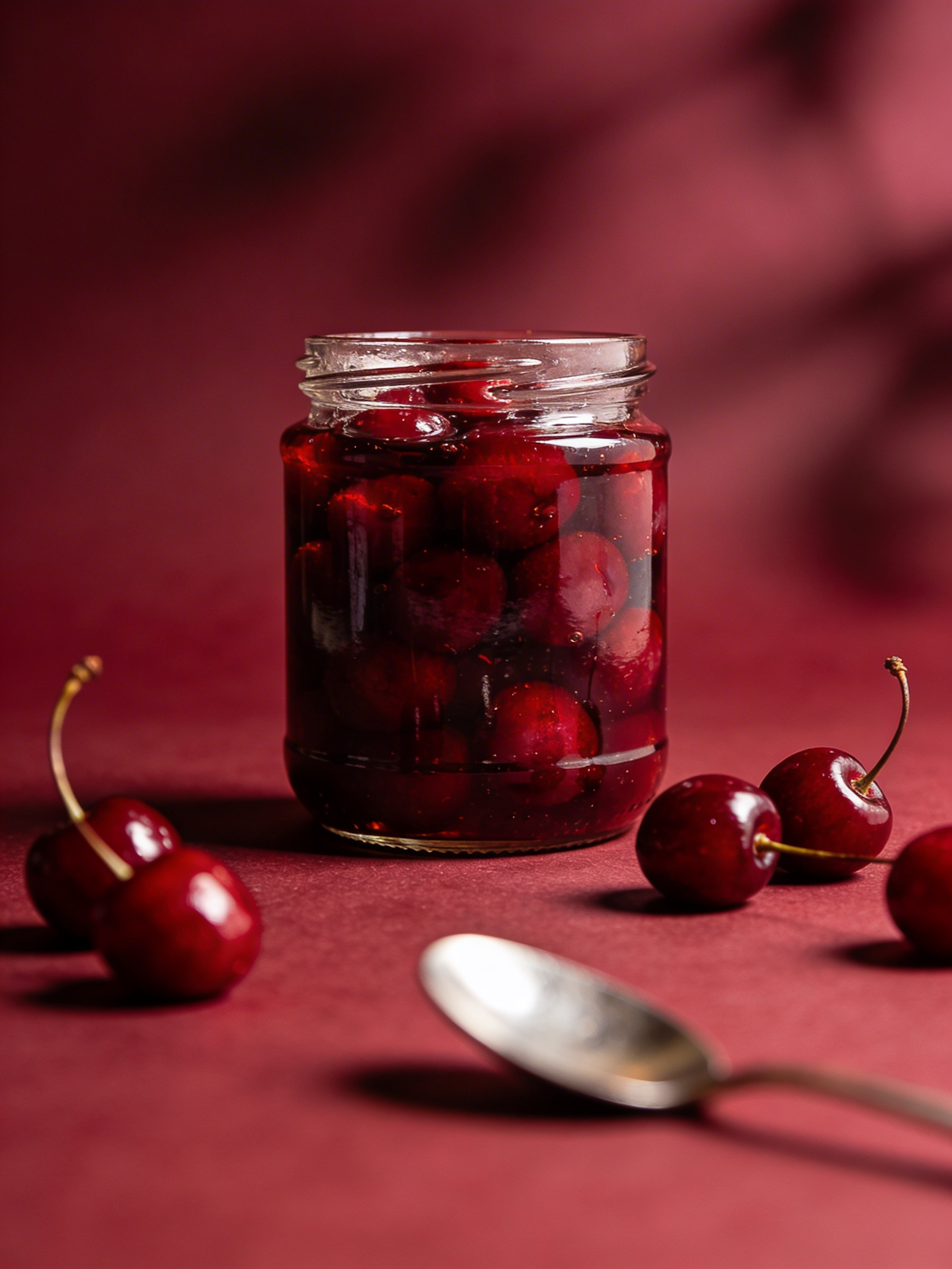 A jar of preserved cherries surrounded by fresh cherries on a red background, with a silver spoon in the foreground.