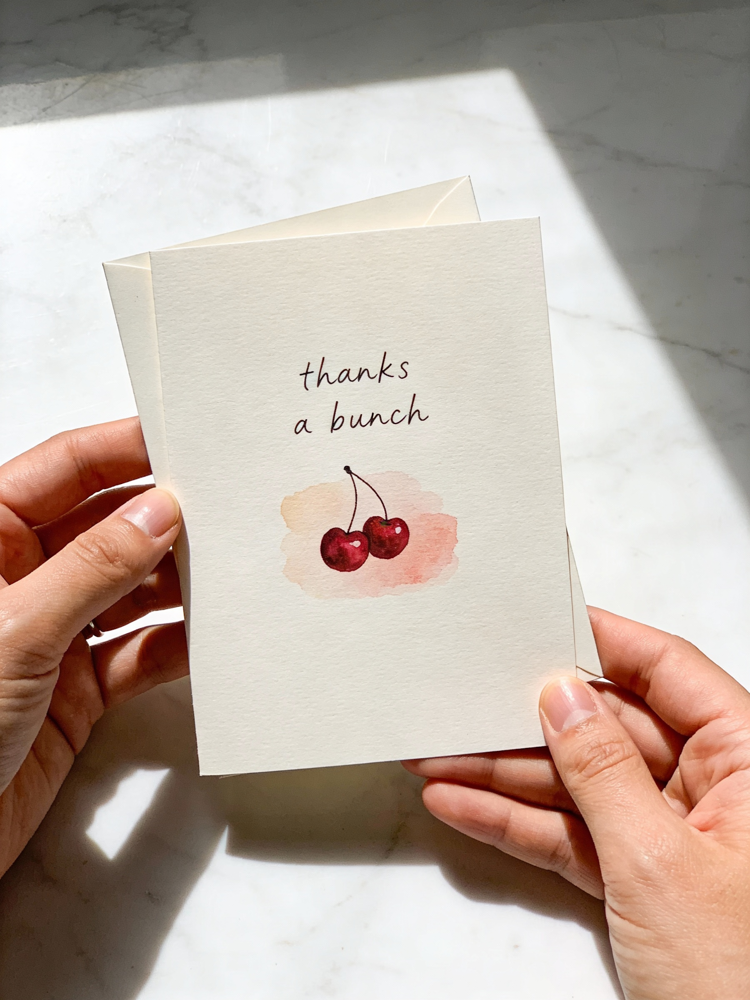 a hand-drawn greeting card with the text "thanks a bunch" and a simple line art illustration of a small bunch of cherries, soft pastel watercolor wash behind the cherries, minimalistic style, warm white textured card stock, holding the card in two hands, background is a clean white marble tabletop with subtle natural shadows, the card is slightly open to reveal part of its top side, soft natural daylight, realistic photo, no extra text, no logos, no watermark