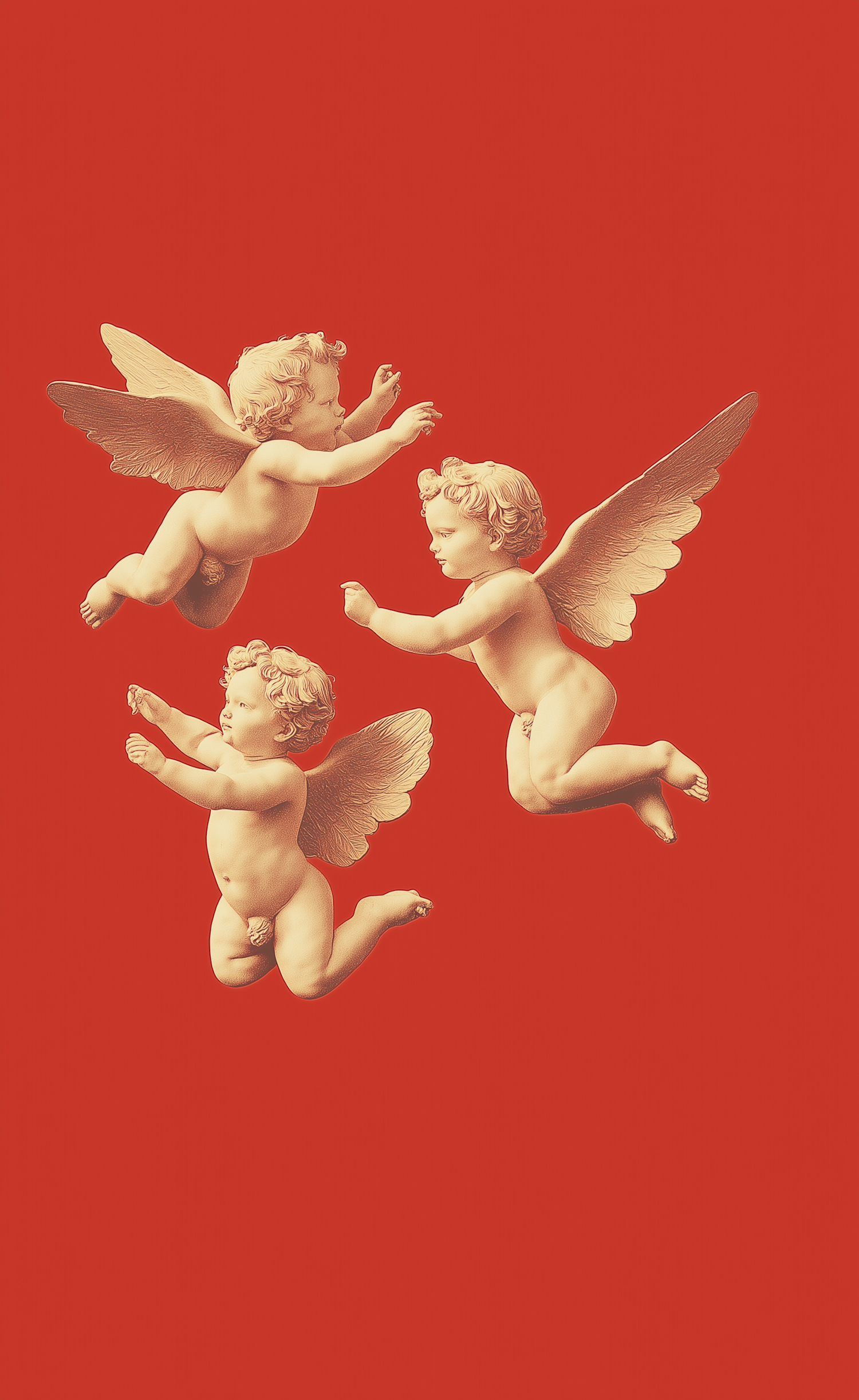 Three cherubic figures with wings float against a bold red background, creating a striking and dynamic visual composition.