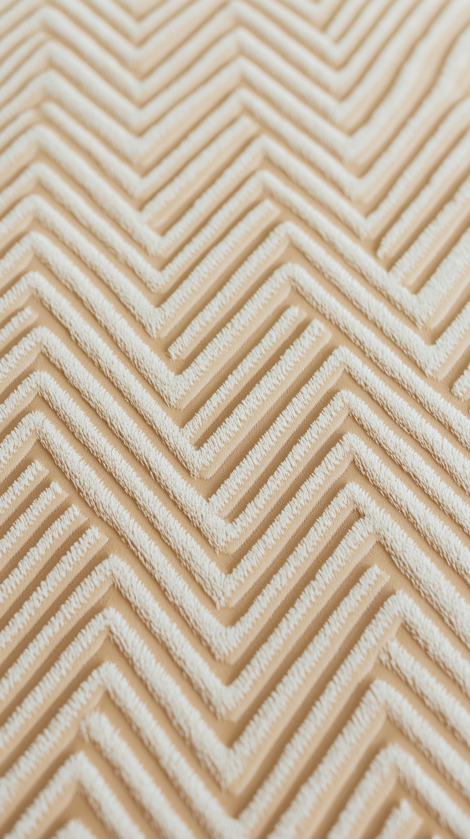 Close-up of a beige and white chevron-patterned fabric with raised, textured lines and a smooth background. Modern and geometric design.