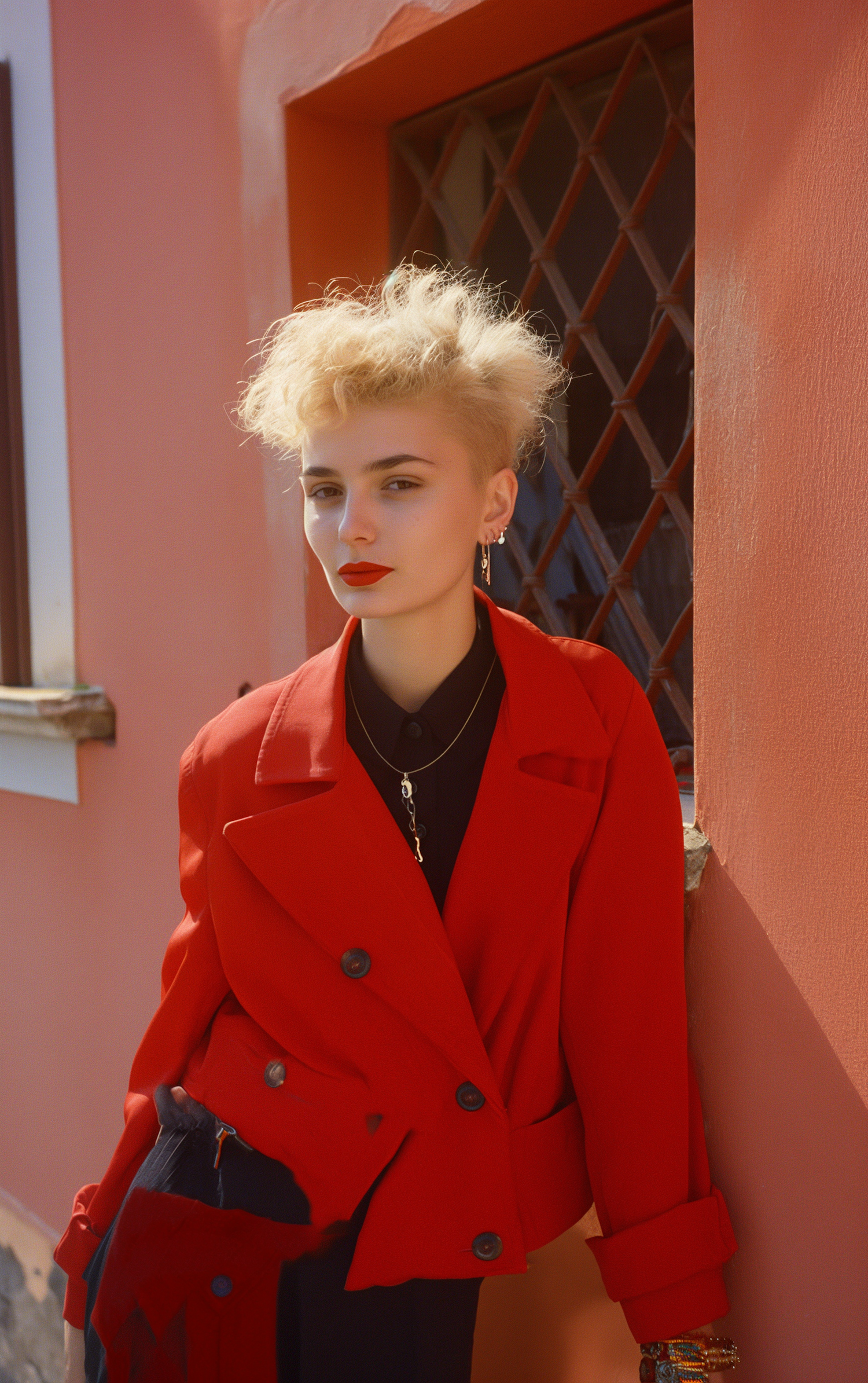Stylish woman with blonde hair in a red jacket poses confidently against a peach wall, exuding modern elegance and bold fashion.