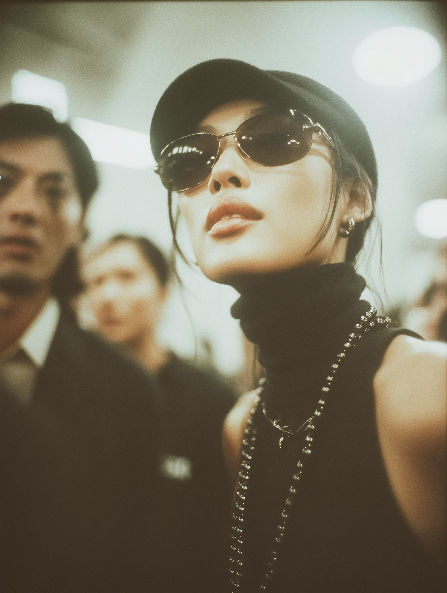 Chic Asian woman in a black beret and sunglasses, exuding confidence in a stylish turtleneck and beaded necklace. Blurred busy background.