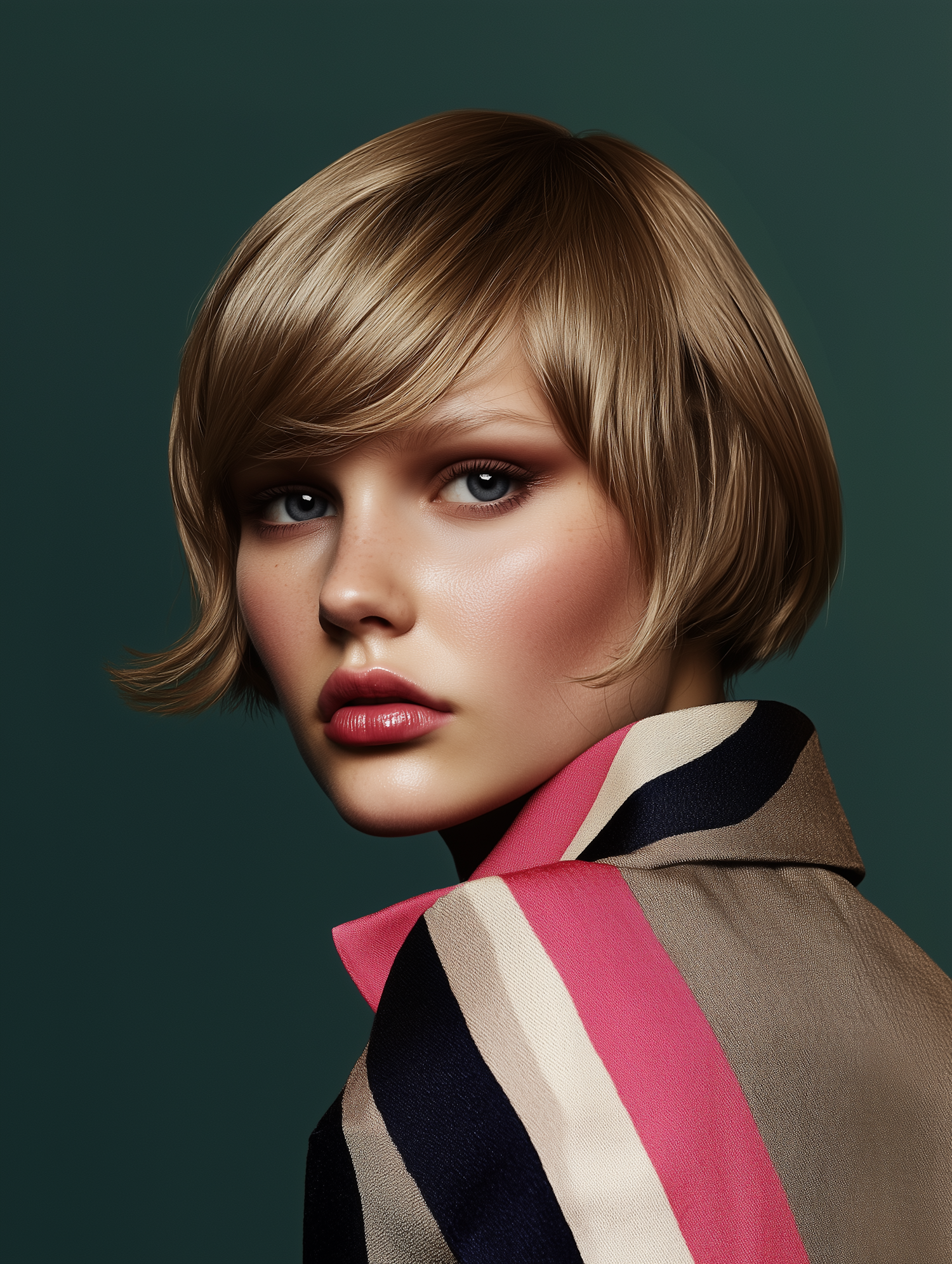 Stylish woman with a chic blonde bob, glossy pink lips, and bold striped outfit against a muted green background.