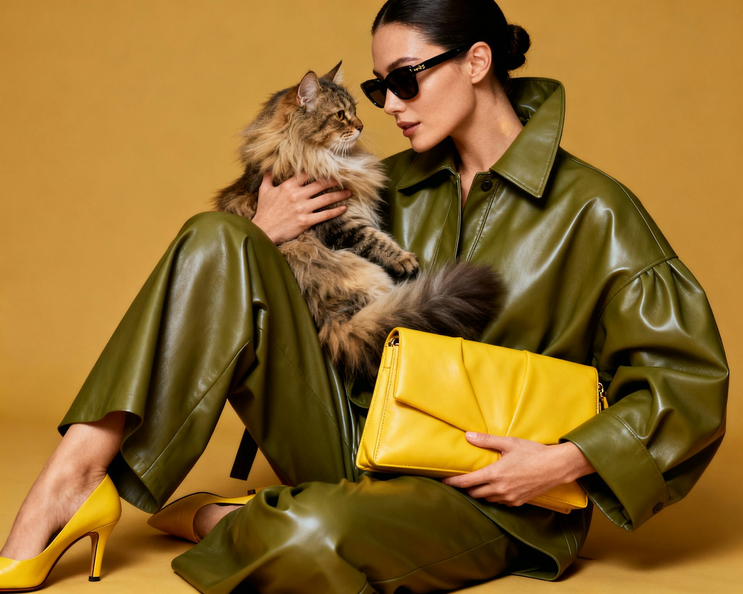 A close-up editorial portrait of a sweet, endearing Black woman wearing a monochromatic olive green leather ensemble. She dons an oversized leather jacket with a high collar and wide sleeves, paired with matching wide-leg leather pants. Accessories include a large yellow clutch bag, yellow high-heeled shoes, and yellow sunglasses — adding bold contrast to the muted olive tones. She gently cradles a fluffy, long-haired cat in her arms, gazing at it with warmth and affection. Her glowing, hyperrealistic skin radiates against a plain, warm ochre background — chosen to harmonize with both her skin tone and the outfit’s palette. Lighting is soft and directional, enhancing texture, emotion, and editorial mood.