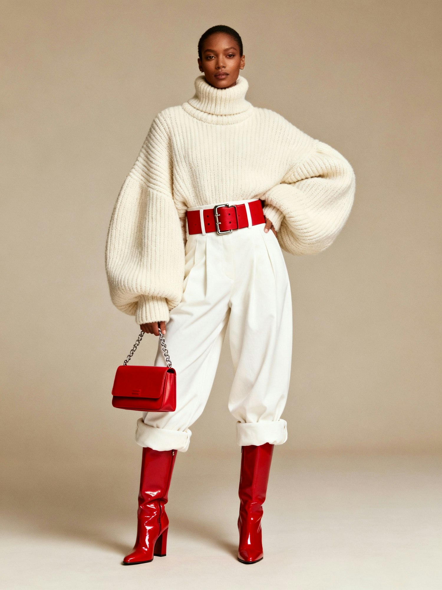 A confident woman standing against a plain background that complements her warm brown skin tone, wearing a chunky cream-colored oversized turtleneck sweater with voluminous sleeves tucked into high-waisted, loose-fitting white pants. The pants are cinched at the waist with a wide red belt featuring two large buckles and tucked into glossy red knee-high boots. She accessorizes with a small red handbag with a chain strap, creating a cohesive and avant-garde look that blends exaggerated proportions, texture contrast, and bold color blocking