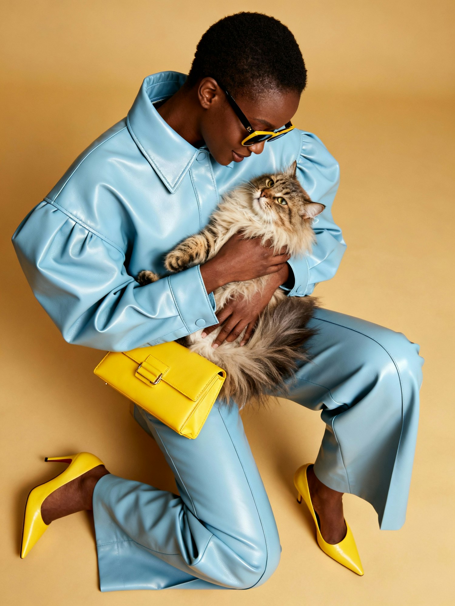 A close-up editorial portrait of a sweet, endearing Black woman wearing a monochromatic Baby blue leather ensemble. She dons an oversized leather jacket with a high collar and wide sleeves, paired with matching wide-leg leather pants. Accessories include a large yellow clutch bag, yellow high-heeled shoes, and yellow sunglasses — adding bold contrast to the muted olive tones. She gently cradles a fluffy, long-haired cat in her arms, gazing at it with warmth and affection. Her glowing, hyperrealistic skin radiates against a plain, warm ochre background — chosen to harmonize with both her skin tone and the outfit’s palette. Lighting is soft and directional, enhancing texture, emotion, and editorial mood.