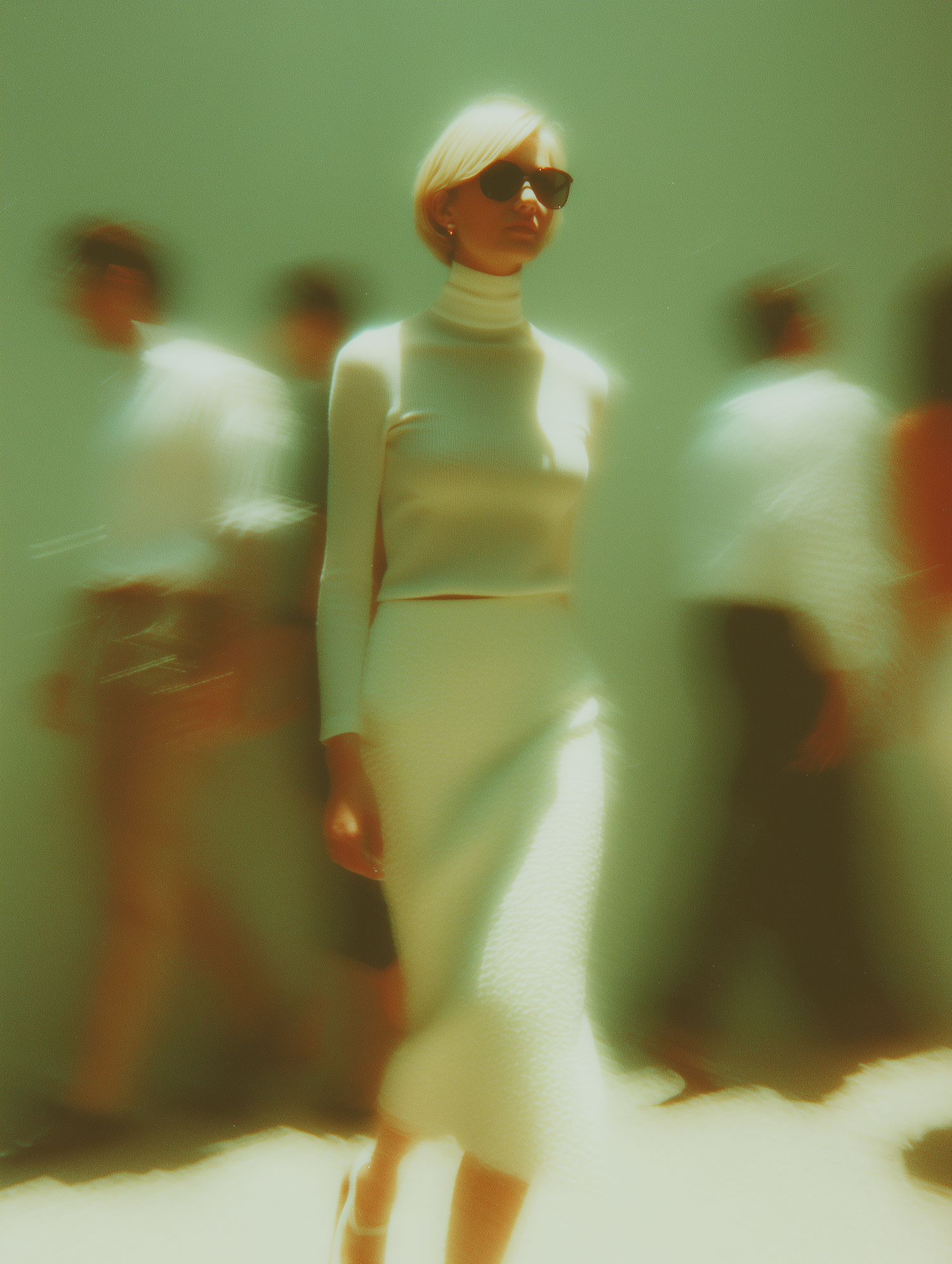 A chic woman in a white turtleneck and skirt with sunglasses stands out against a blurred, vintage-toned urban background.