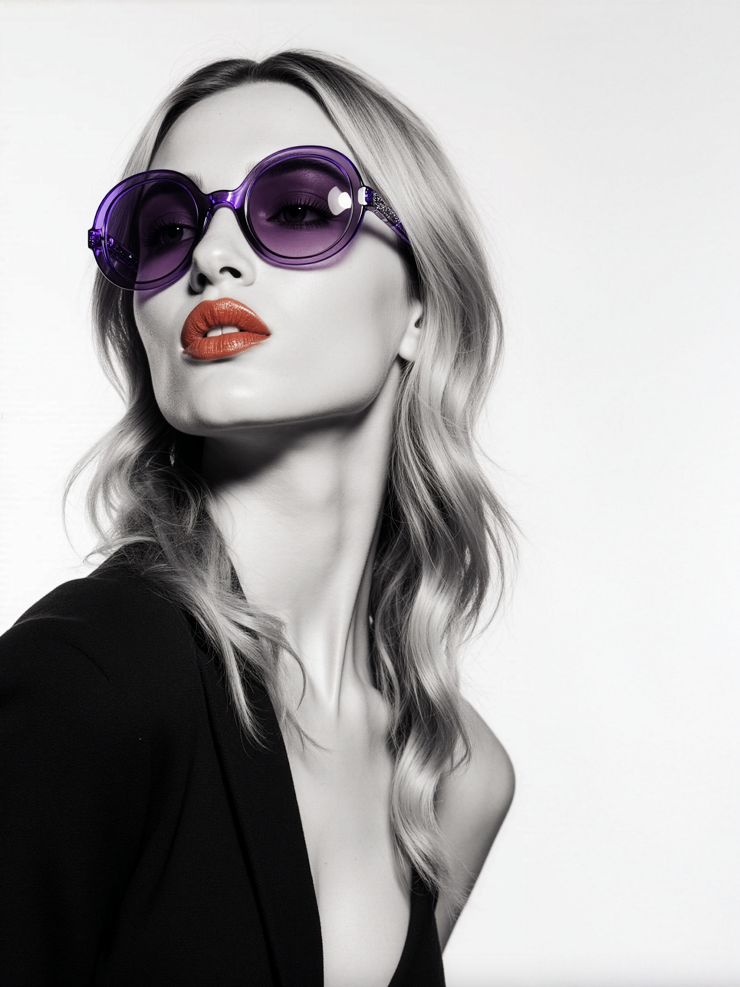 A fashionable portrait of a person with blonde hair, purple sunglasses, and red lips, set against a minimalist white background.