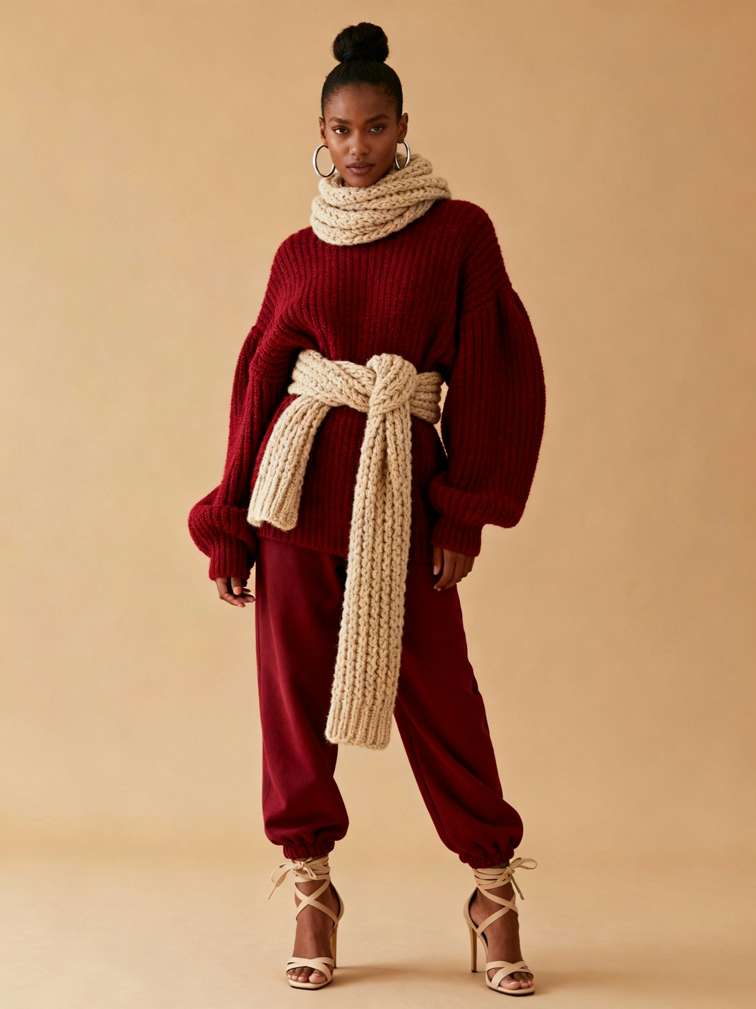 A confident woman standing against a plain warm beige background that complements her warm brown skin tone and the rich red tones of her outfit. She wears an oversized red knitted sweater with exaggerated sleeves, paired with slightly baggy red pants tucked into beige lace-up high-heeled sandals. A thick beige knitted scarf is wrapped around her neck and tied at the waist, adding sculptural contrast. Her hair is styled in a high bun, and she accessorizes with large hoop earrings. The look blends cozy maximalism, bold silhouette play, and avant-garde runway styling.