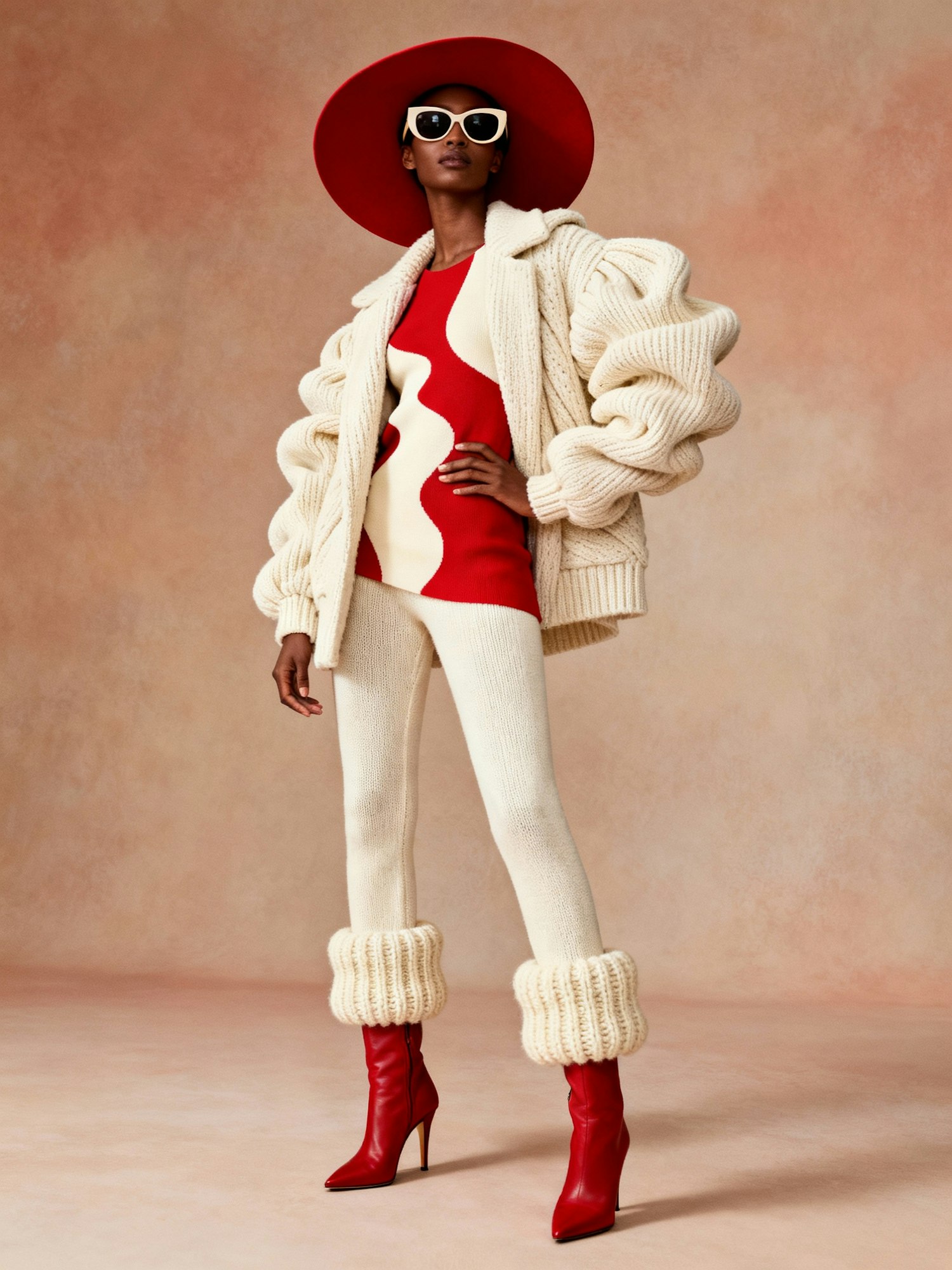 A fashionable individual in a red hat and boots, cream knitwear, and white sunglasses, showcasing a bold and modern style.