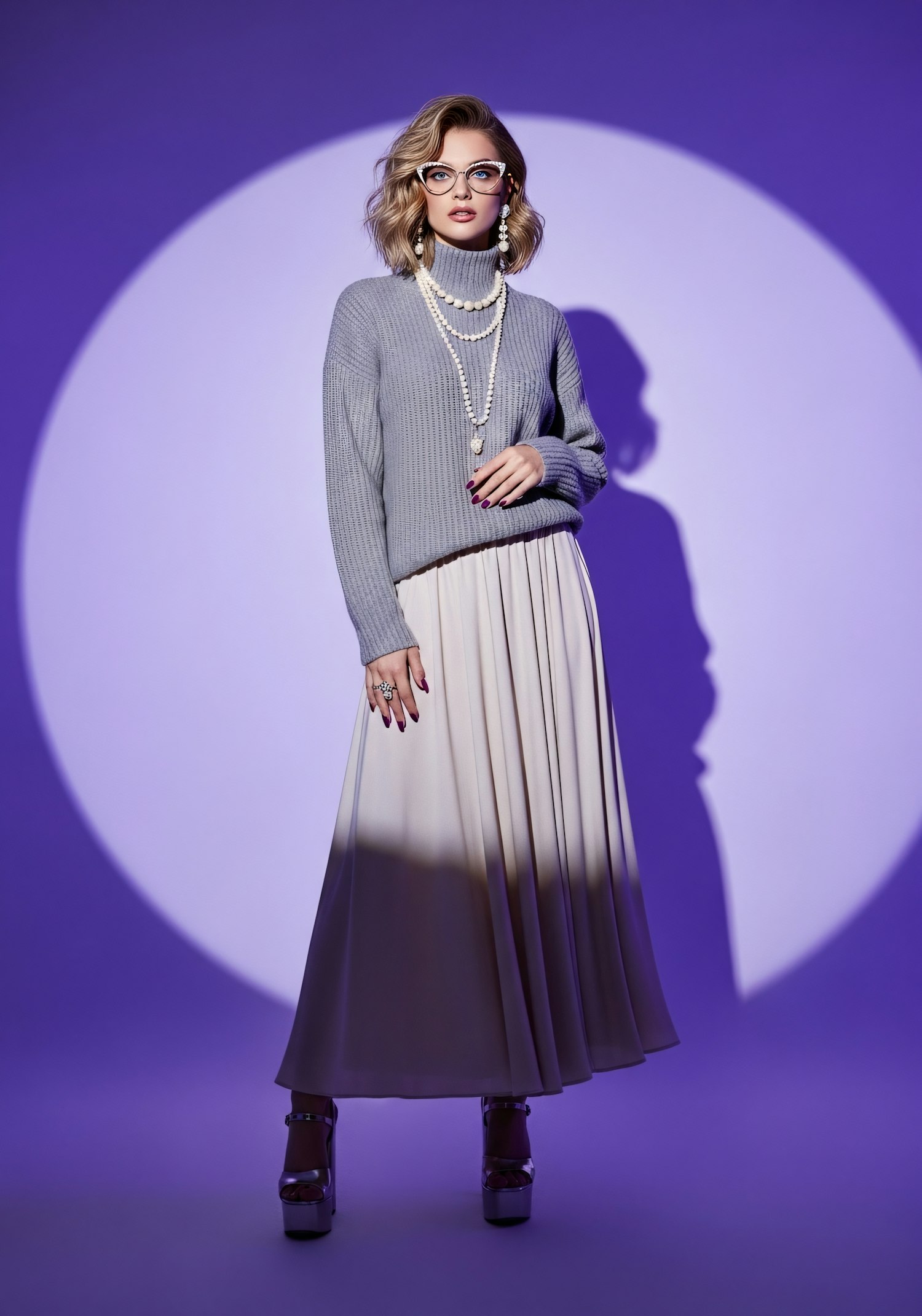 A fashionable person in a gray sweater and cream skirt, accessorized with pearls and glasses, stands against a purple spotlight background.