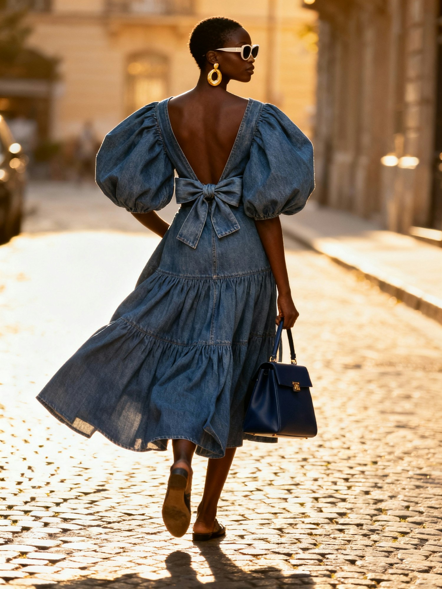A fashionable woman in a denim dress and accessories walks on a sunlit cobblestone street, carrying a blue handbag.