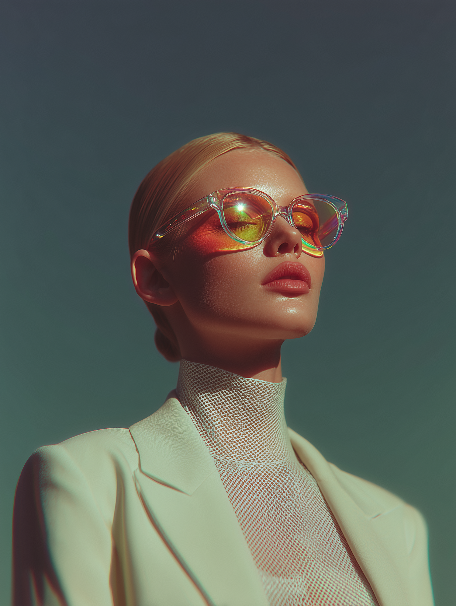 A fashionable person in reflective sunglasses and a white blazer against a teal background, showcasing modern style and vibrant lighting.
