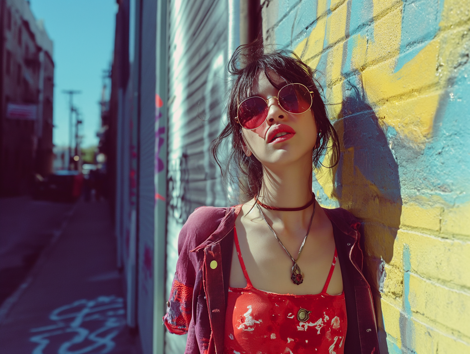 Stylish woman in red sunglasses and dress leans against graffiti wall in urban alley, exuding a cool, relaxed vibe.
