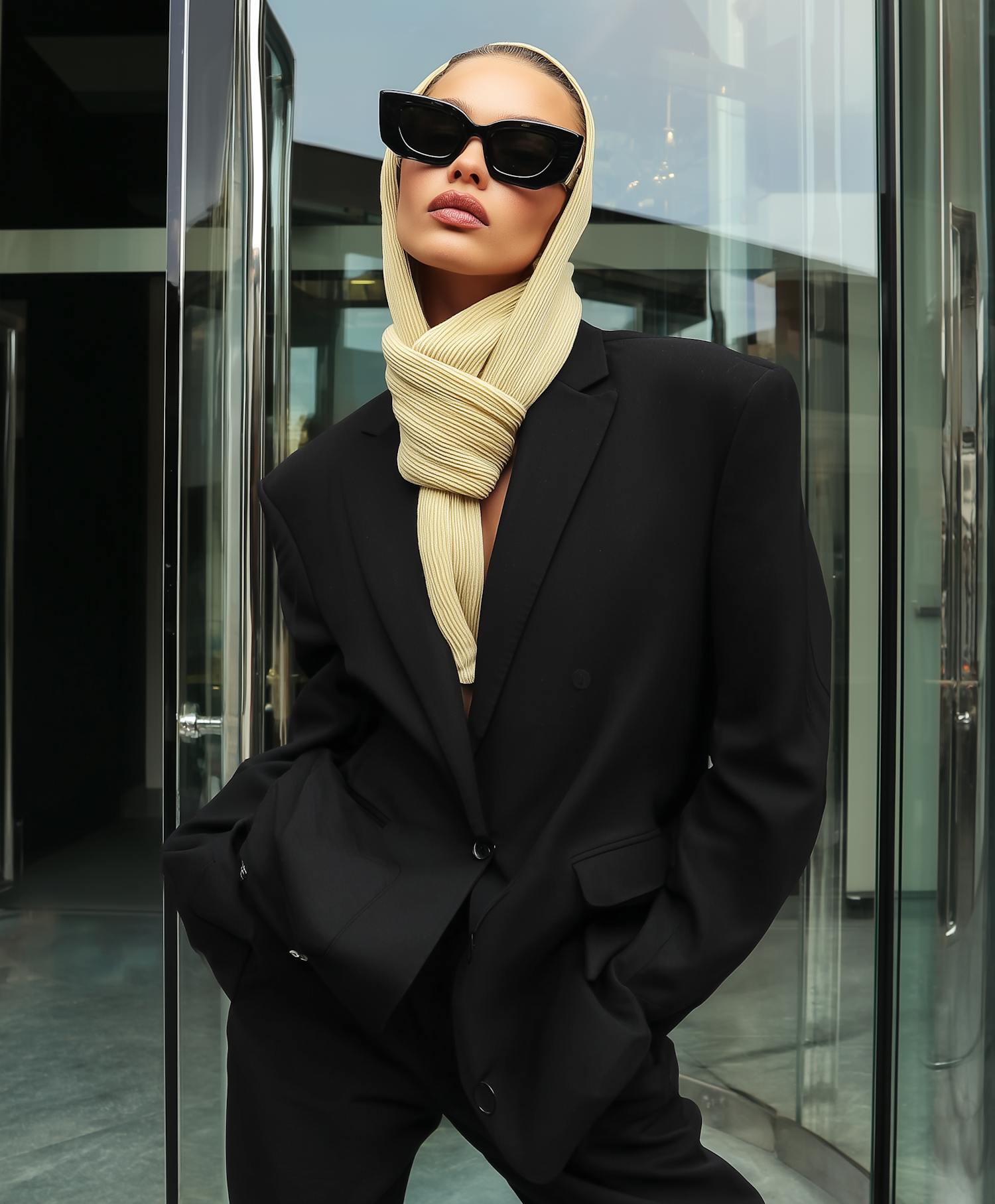Chic woman in oversized black blazer, beige scarf, and sunglasses poses confidently in front of a modern glass building.