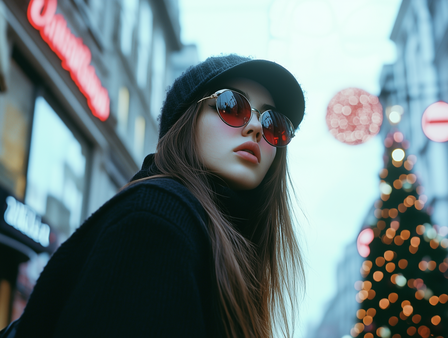 Chic woman in black beret and red sunglasses in a festive cityscape with holiday lights and a Christmas tree in the background.