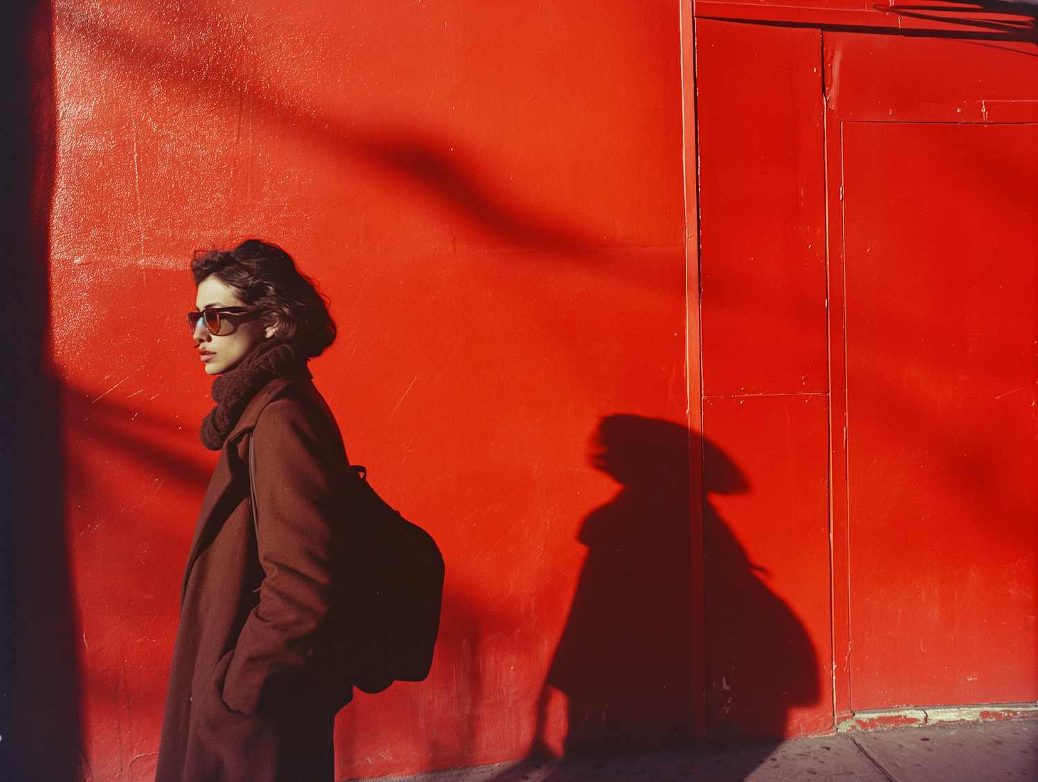 Stylish individual in dark coat and sunglasses walks by a vibrant red wall, casting a striking shadow. Urban fashion and bold colors.
