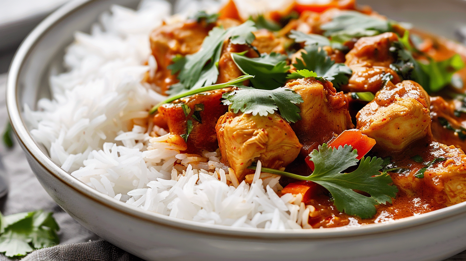 Delicious chicken curry with rice, garnished with cilantro and carrots, served in a white bowl. Perfectly cooked and visually appealing.