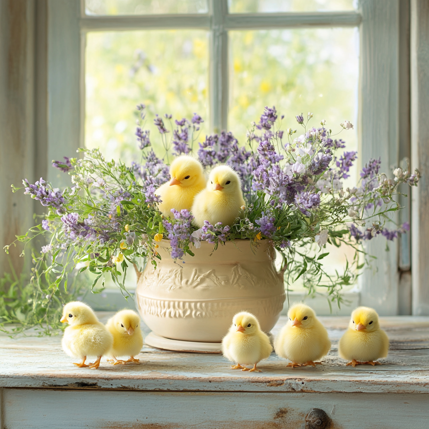 Adorable yellow chicks with lavender flowers in a rustic pot, set against a sunlit window for a cozy springtime vibe.