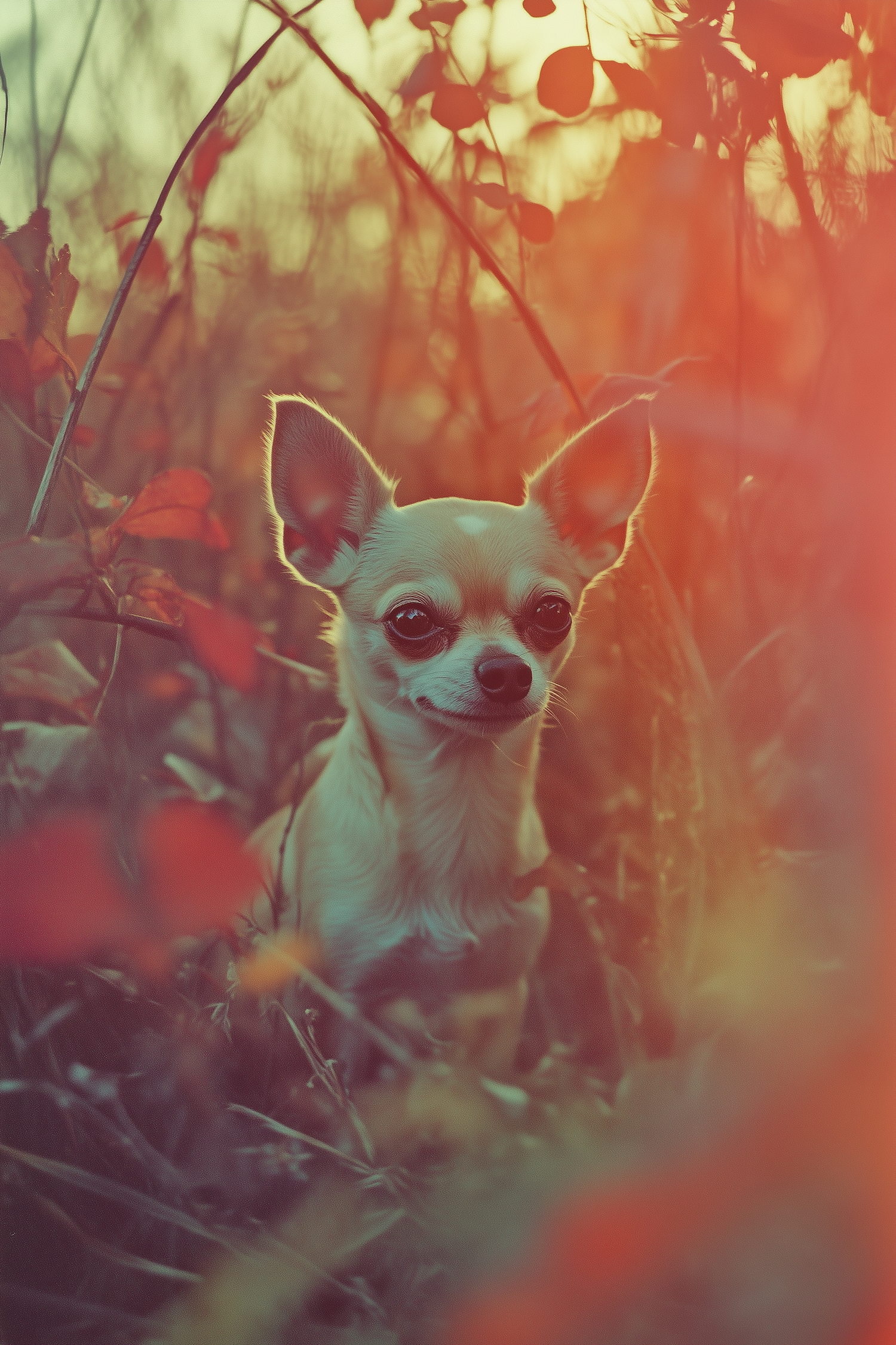 Chihuahua in autumn foliage, surrounded by warm sunlight and colorful leaves, creating a serene and natural atmosphere.