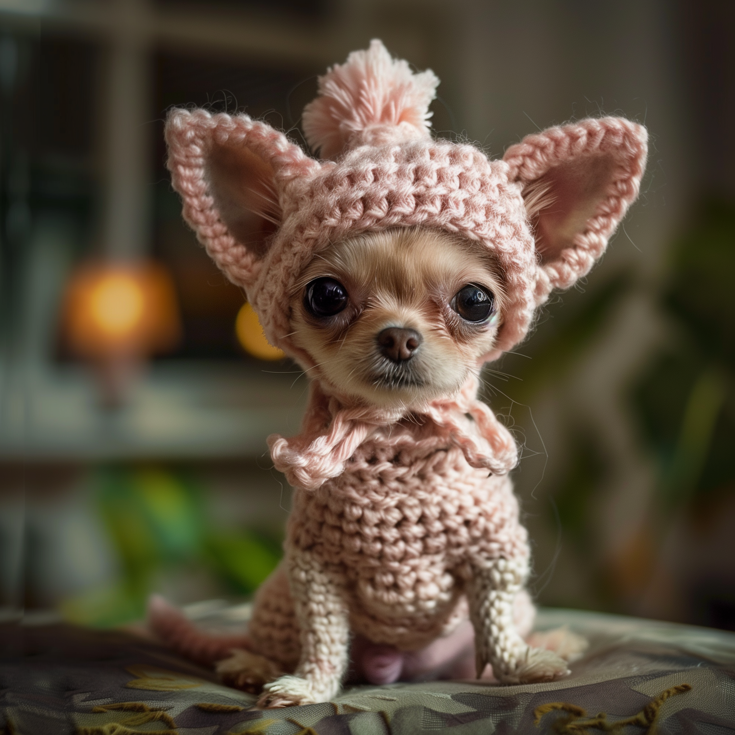 Adorable Chihuahua puppy in a pink knitted outfit with a pom-pom hat, sitting on a cushion in a cozy, warmly lit indoor setting.