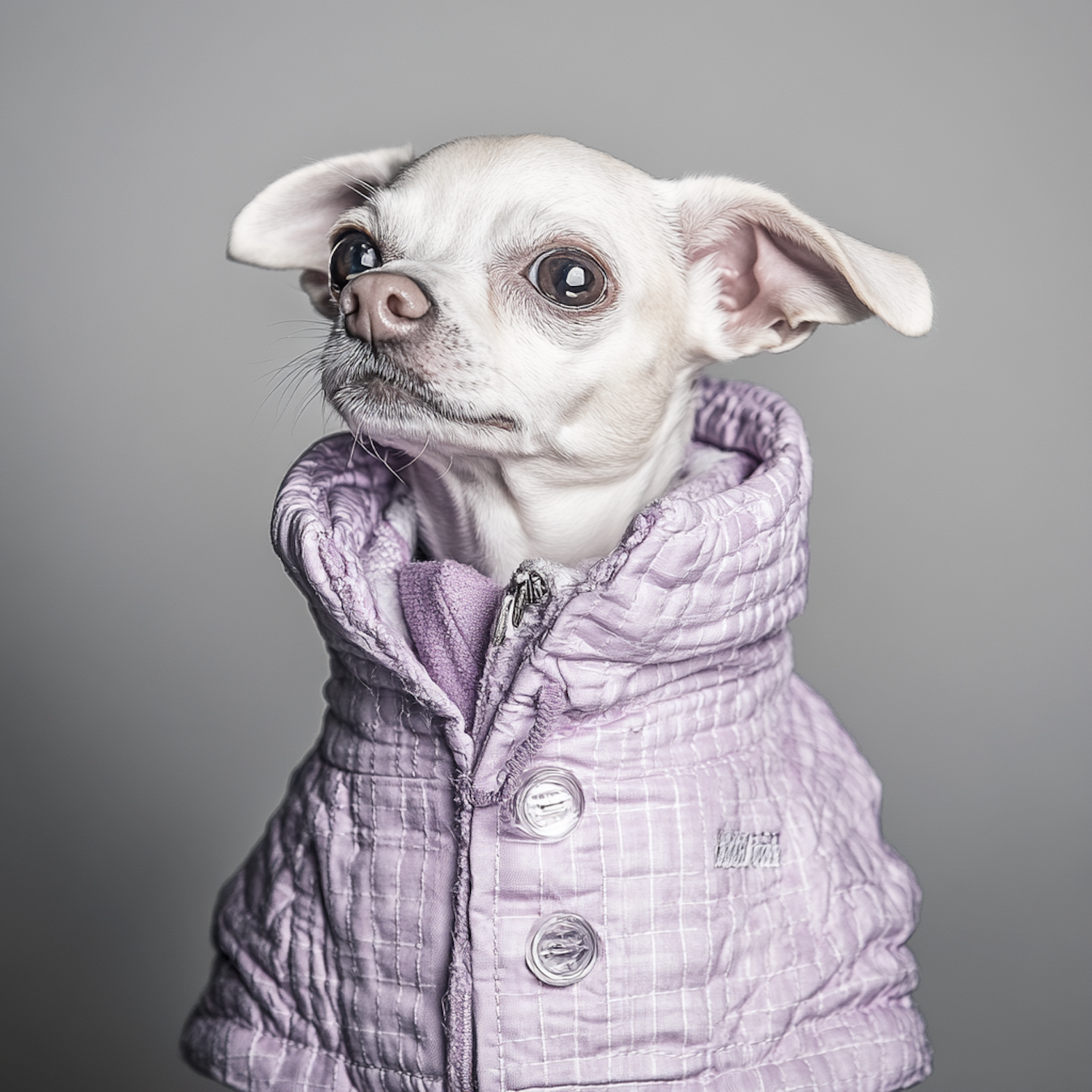 Chihuahua in a stylish light purple quilted jacket, looking curious with perked ears against a neutral gray background.