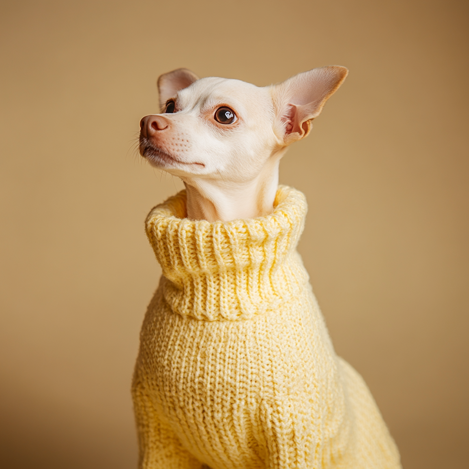 Adorable small dog in a yellow knitted sweater against a beige background, showcasing a cozy and stylish look.