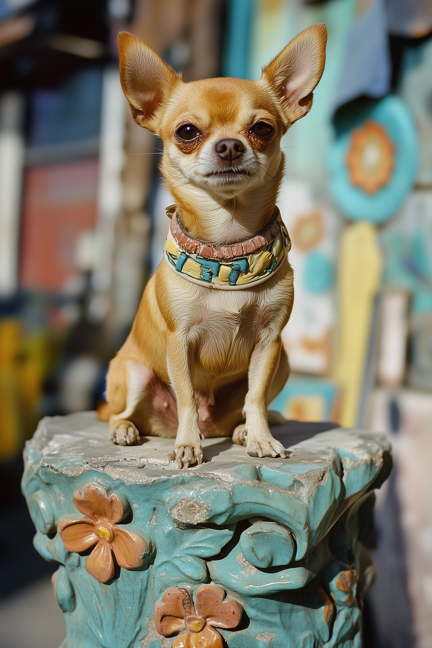 Adorable tan Chihuahua sitting on a turquoise floral pedestal, wearing a colorful collar with a vibrant artistic background.