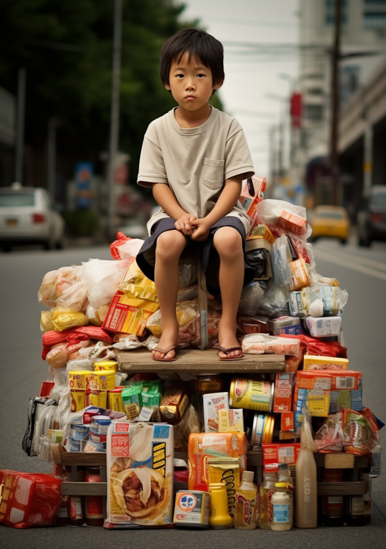 Young boy sits on a cart filled with colorful packaged goods on a city street, looking contemplative.